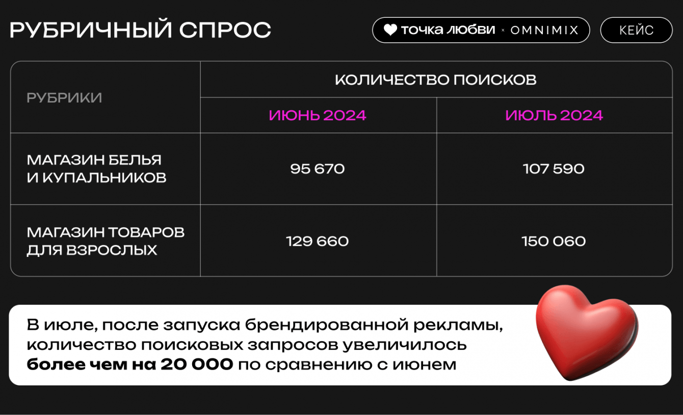 Спрос на ключевые категории — магазины белья и купальников, а также магазины товаров для взрослых — демонстрирует устойчивый рост. В июле, после запуска брендированной рекламы, количество поисковых запросов увеличилось более чем на 20 000 по сравнению с июнем. Этот значительный прирост подтверждает важность приоритетного размещения карточек «Точки Любви» на Яндекс Картах, чтобы эффективно охватить и удержать заинтересованную целевую аудиторию.