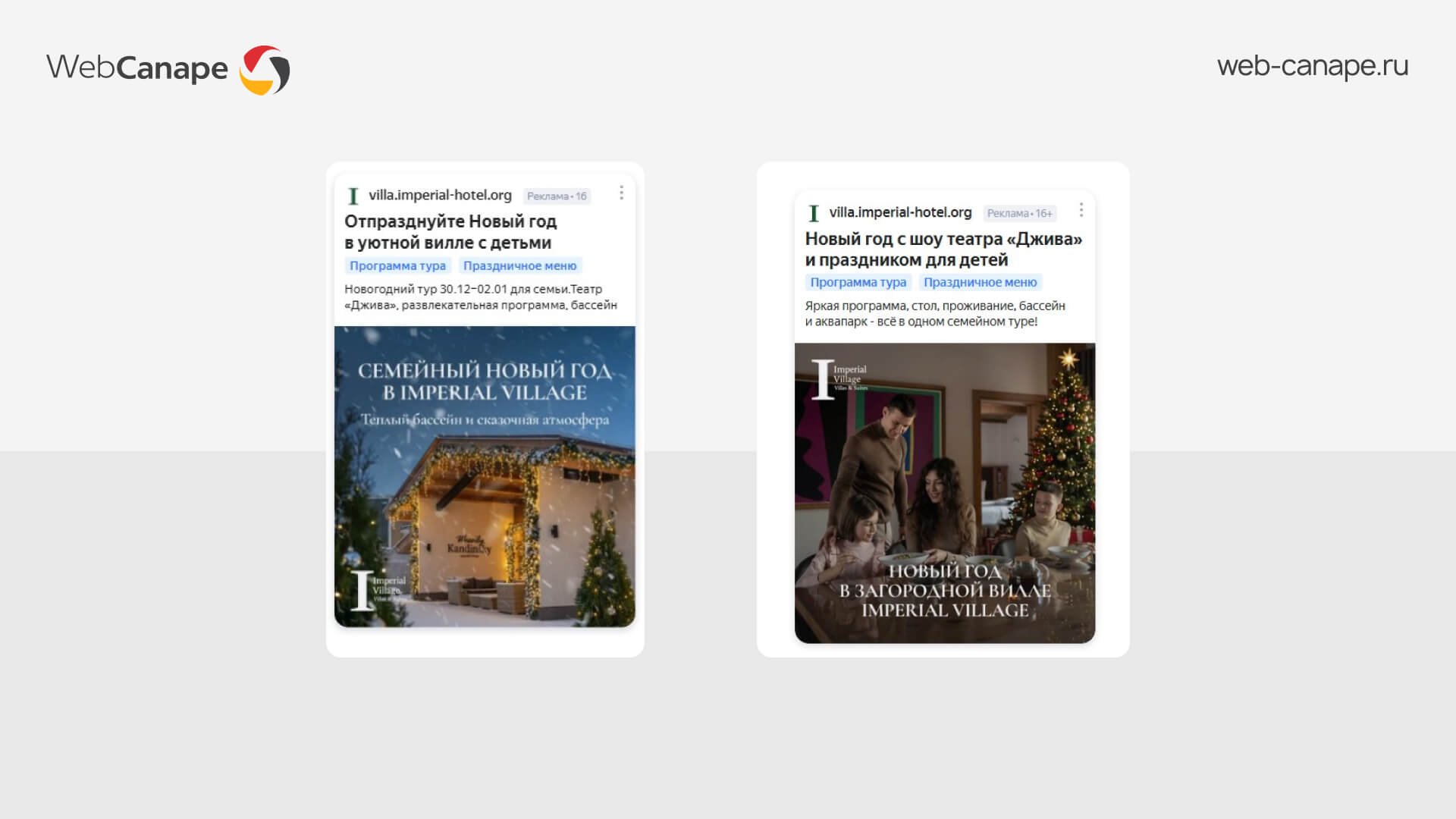 На основе материалов от клиента определили, что новогодний формат ориентирован в первую очередь на семьи с детьми. Под сезонные страницы подготовили отдельные рекламные баннеры с акцентом на эту аудиторию, запустили кампании именно в момент, когда начался активный поиск мест для празднования.