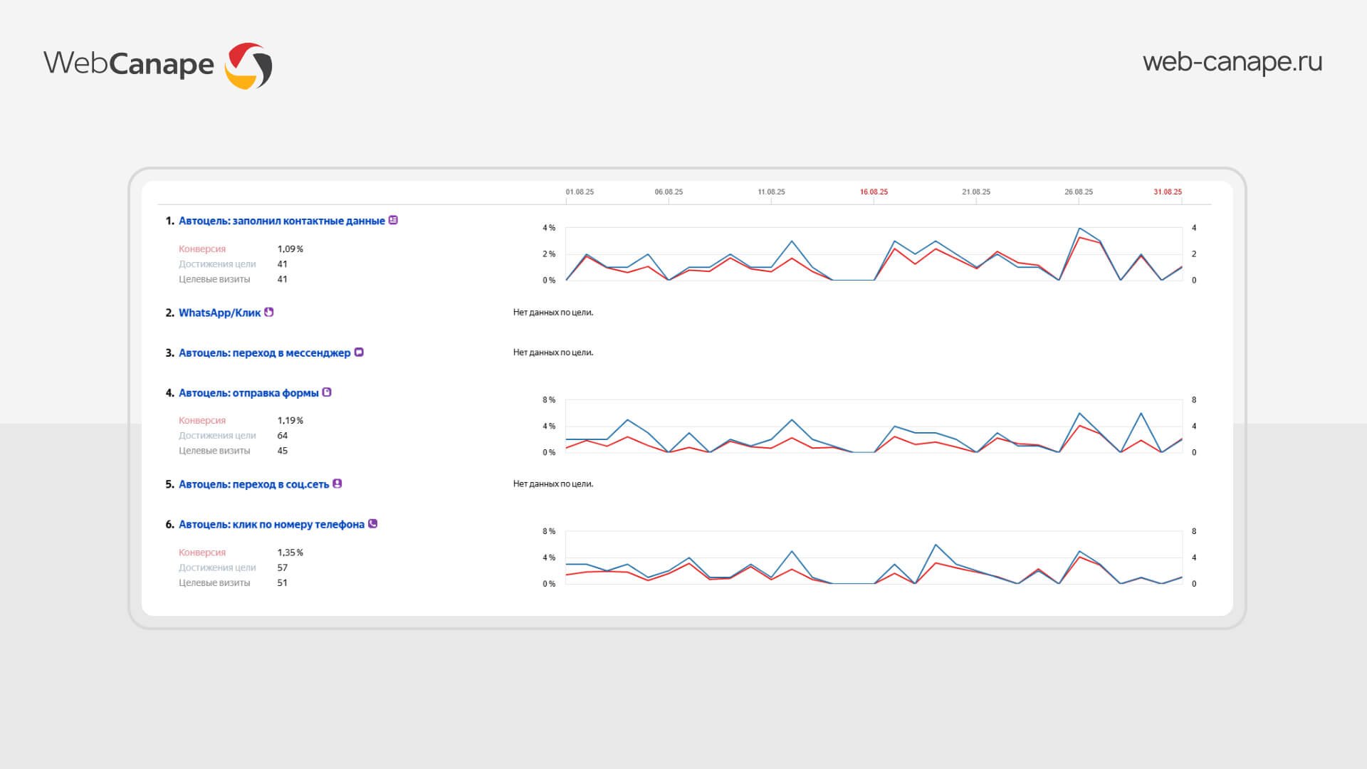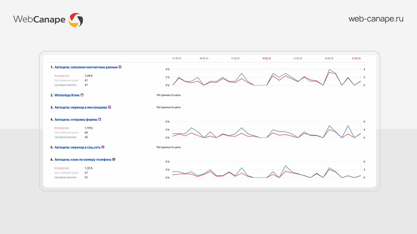 Проведенный нами аудит показал: с аналитикой на проекте явные проблемы. На сайте отсутствовали цели на отправку форм, использовались только автоцели Яндекс Метрики — а они фиксируют действия некорректно, включая случайные клики и незавершенные взаимодействия. Звонки не отслеживались, хотя для премиального сегмента — это основной способ связи. В результате клиент видел в статистике 10 обращений, хотя реально их могло быть 15 или 5 — точных данных не было.