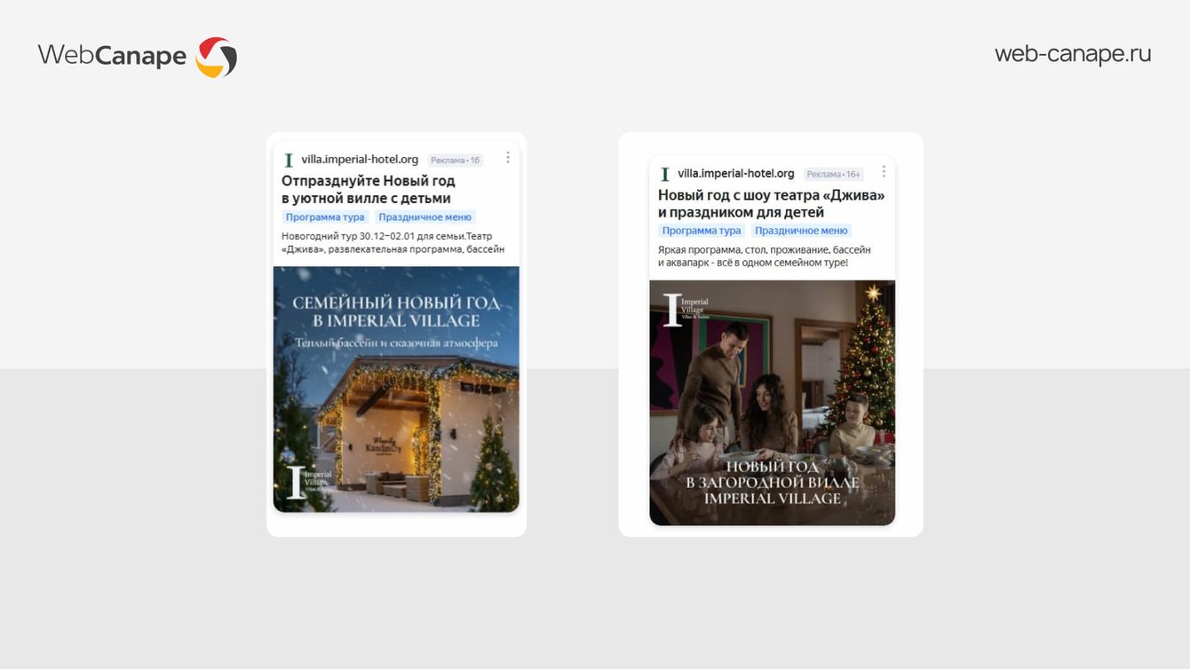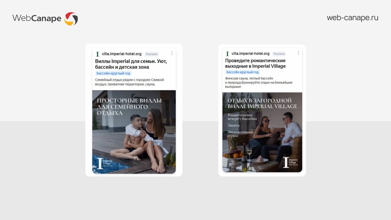 Для рекламы в РСЯ подготовили баннеры под разные сегменты целевой аудитории: для семей с детьми сделали акцент на безопасности и домашнем уюте, для пар — на романтике и уединении.