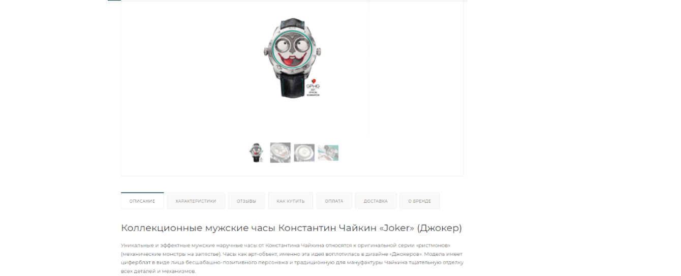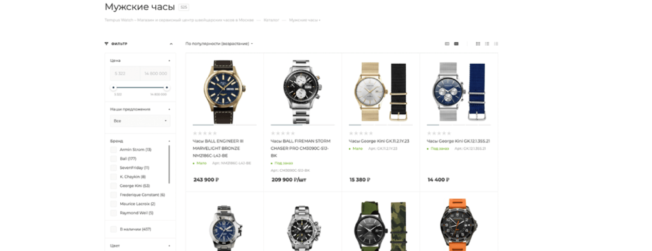 Добавили описания товаров с информацией о циферблате, корпусе и об особенностях, «фишках» модели. Страницы товара стали подробными, проработанными и выше ранжируются в поиске.