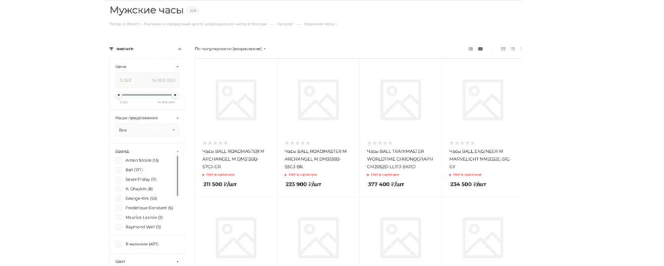 Добавили теги — дополнительные элементы навигации, которые помогают выбрать товар по характеристикам (механизму, материалу, бренду). Например, в каталоге женских часов появились теги «Механические», «Кварцевые», «Сапфировое стекло», «Armin Strom» и другие.