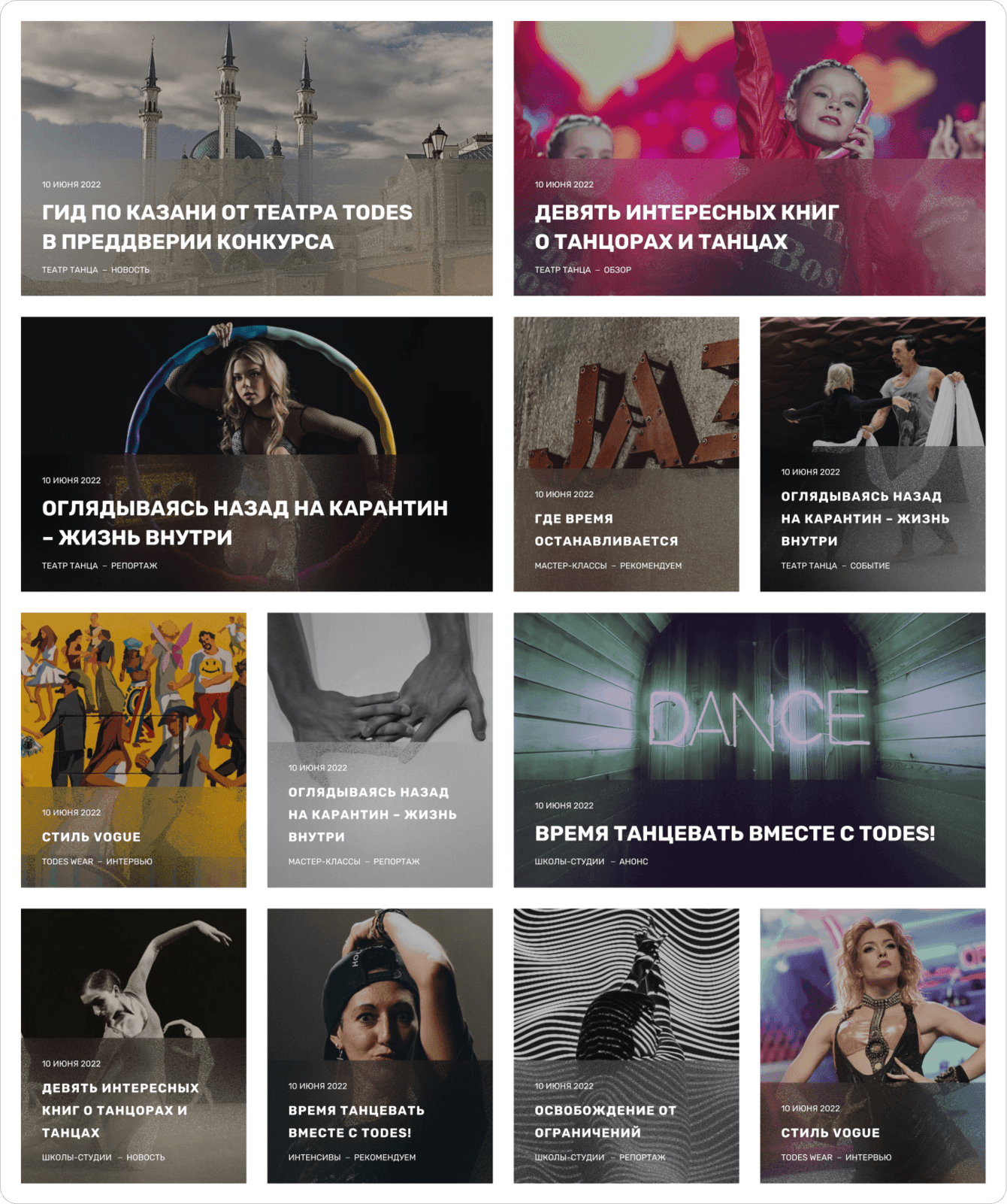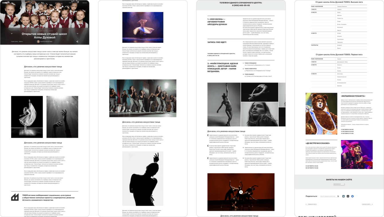 Новости на этом ресурсе объединяются со всех девяти активностей — это студии школы, театр, гастроли, баттлы, интенсивы, мастер-классы, дизайнерская одежда, отчетные концерты и фесты.
