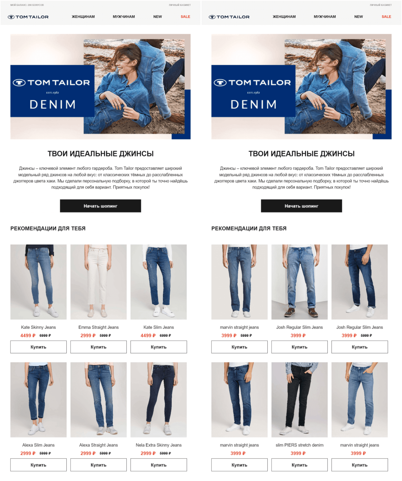 2. Ценовые подборки. Средний чек в заказе Tom Tailor — 5 тыс. рублей. Чтобы создать релевантное предложение для клиентов, сделали подборки по цене и разделили их на две категории: товары с примерной стоимостью 5 тыс. рублей и 3 тыс. рублей. Примечательно, что обе механики оказались в два раза эффективнее по конверсии в заказ, чем акционные рассылки. При этом компания не раздает скидки и сохраняет маржу.