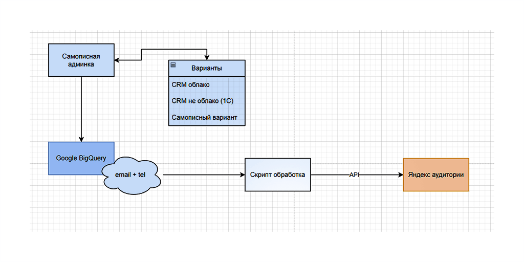 В клиентской базе хранится информация обо всех людях, которые совершали покупки за время работы магазина: телефон, почту, дату заказа и сумму. Если загрузить эти данные в Яндекс Аудитории, то мы сможем показывать рекламу конкретному человеку в нужный день. При этом мы хотели, чтобы данные обновлялись автоматически, без ежедневной загрузки вручную.
