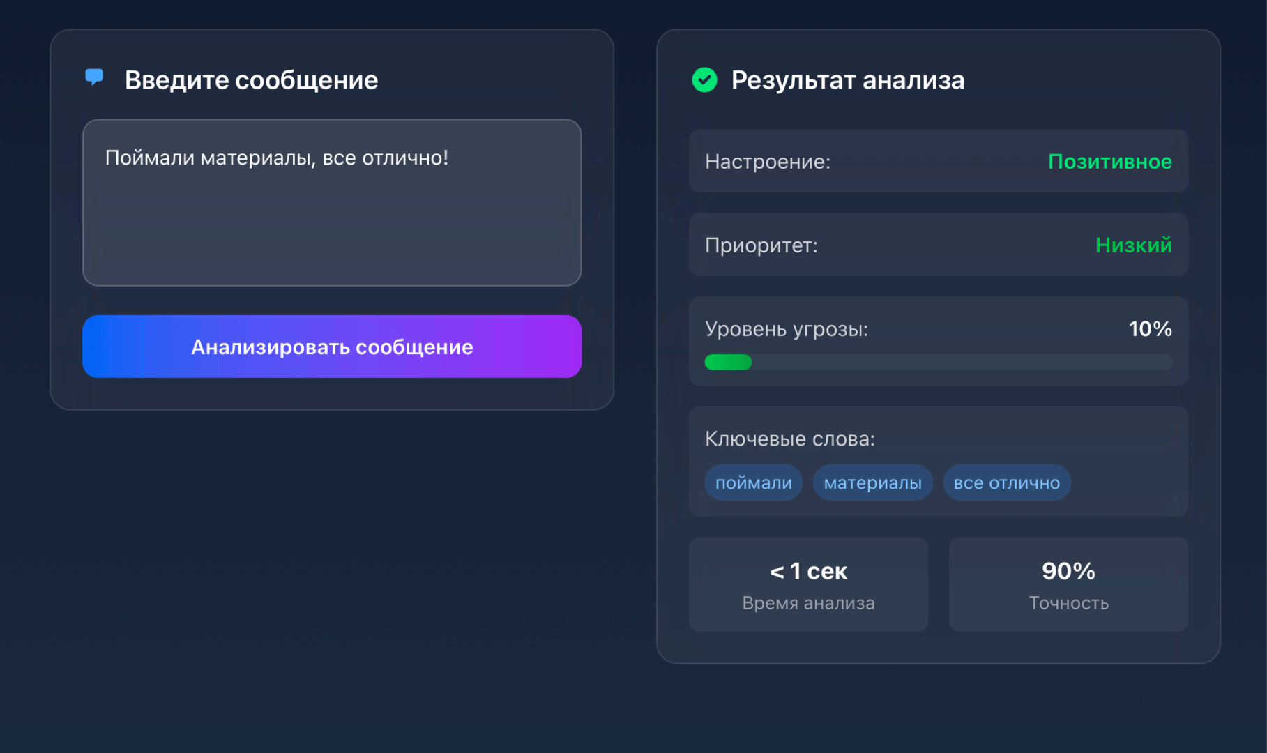При этом отдельным важным блоком системы стало обезличивание данных: перед передачей сообщения в LLM сервис убирает персональные и чувствительные данные, чтобы модель работала с безопасным контекстом. Уже после этого LLM анализирует сообщение, определяет эмоциональную окраску, оценивает, есть ли в нем тревожный сигнал, и выдает заключение, которое дальше используется в логике алертов и сводок.
