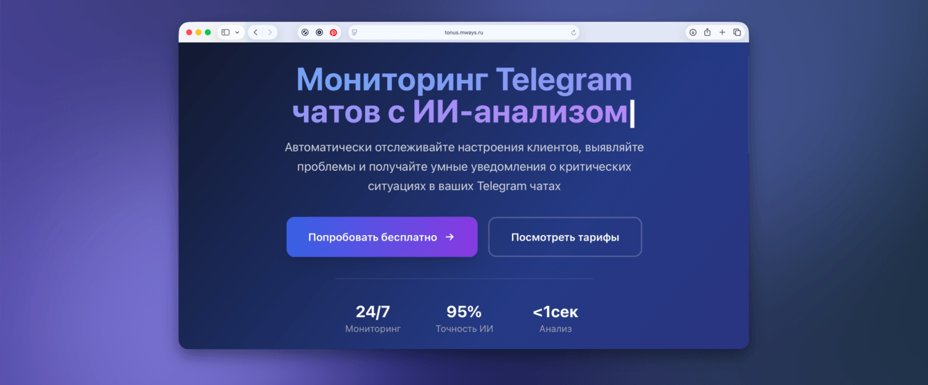 После проверки на собственных процессах мы начали масштабировать Tonus как полноценный продукт. Из внутреннего инструмента контроля он вырос в сервис, который можно использовать как системное решение для агентств и команд, работающих в большом количестве клиентских чатов.