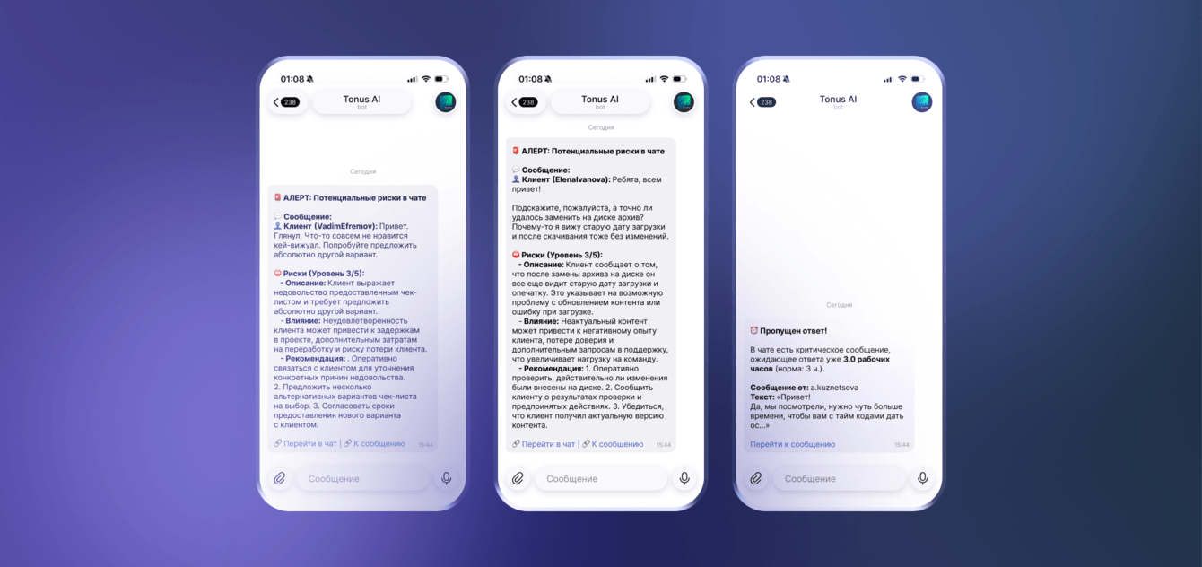 Ключевая ценность Tonus в том, что он превращает хаос переписки в понятную управленческую выжимку. Бот понимает контекст общения, помогает отделить рабочий шум от реального риска, подсвечивает узкие места в коммуникации и выводит наверх только те сигналы, которые действительно требуют внимания руководства или аккаунт-команды. Если система фиксирует тревожный паттерн — например, недовольство клиента, угрозу срыва сроков, неуверенный ответ со стороны команды или важное сообщение без реакции, — Tonus отправляет алерт в админ-контур. В нем бот показывает исходное сообщение, формулирует суть риска, оценивает уровень угрозы и помогает быстрее принять решение по следующему действию.