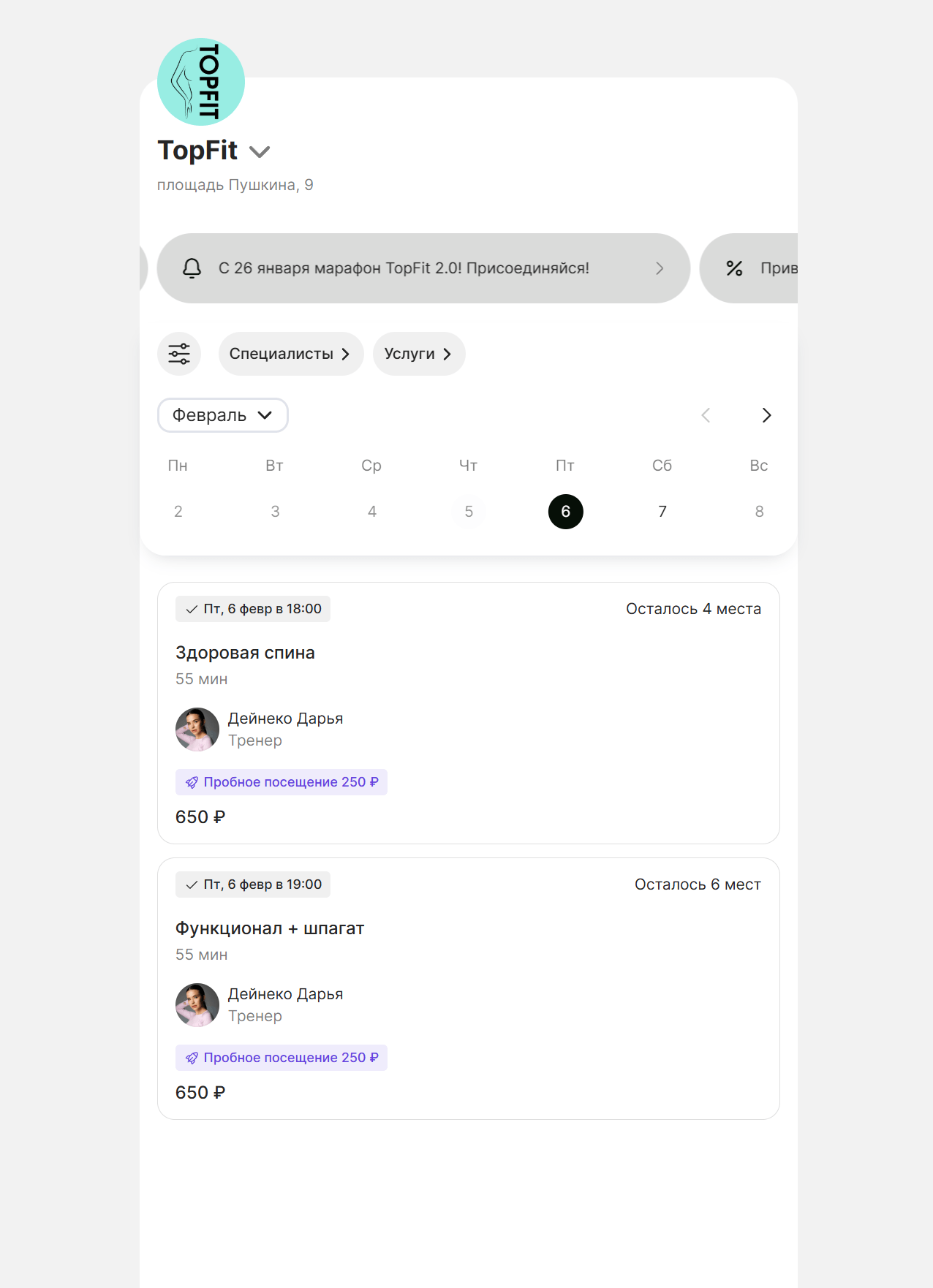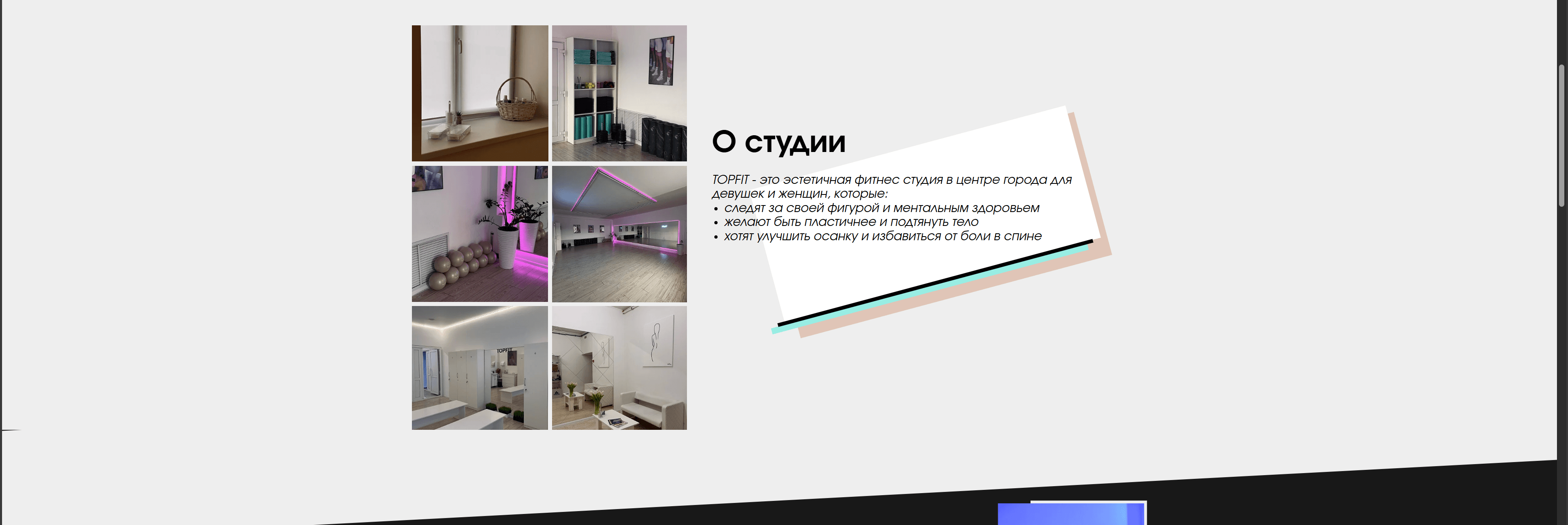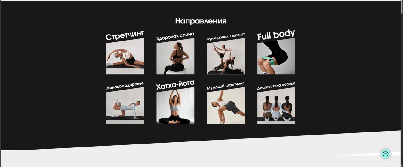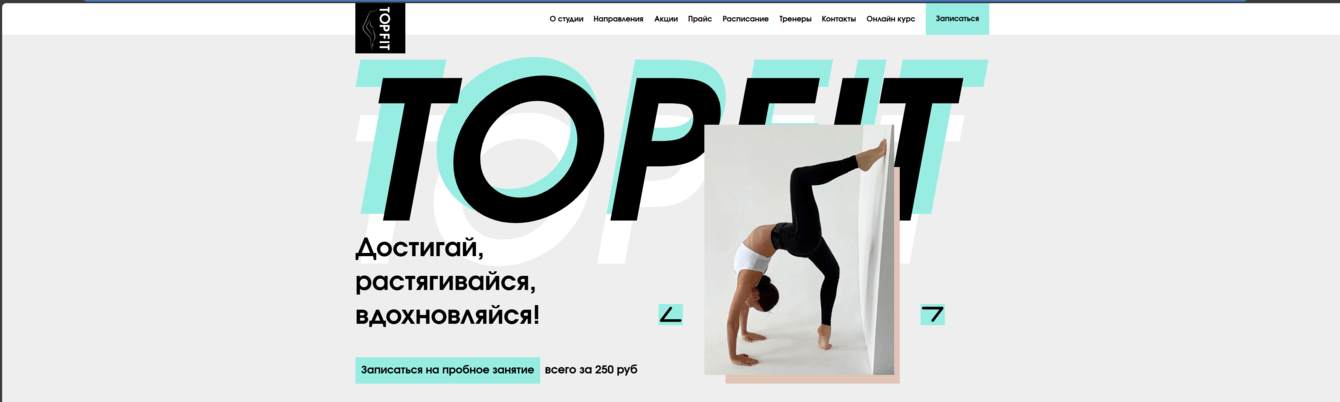 Разработать продающий одностраничный сайт для TOPFIT в Иваново, который быстро объясняет, чем занимается студия (растяжка и фитнес), кому подойдёт, какие направления есть, и главное — приводит пользователя к записи на пробное занятие. При этом важно было сразу закрыть типовые вопросы потенциальных клиентов: какие форматы тренировок доступны (например, «здоровая спина», «функционал + шпагат», full body, хатха-йога и др.), чем студия отличается (эстетичное пространство, индивидуальный подход, квалифицированные тренеры), где находится и как связаться, а также дать удобный доступ к расписанию/записи, акциям и прайсу, чтобы минимизировать путь до целевого действия и снизить количество «уточняющих» обращений в мессенджеры.