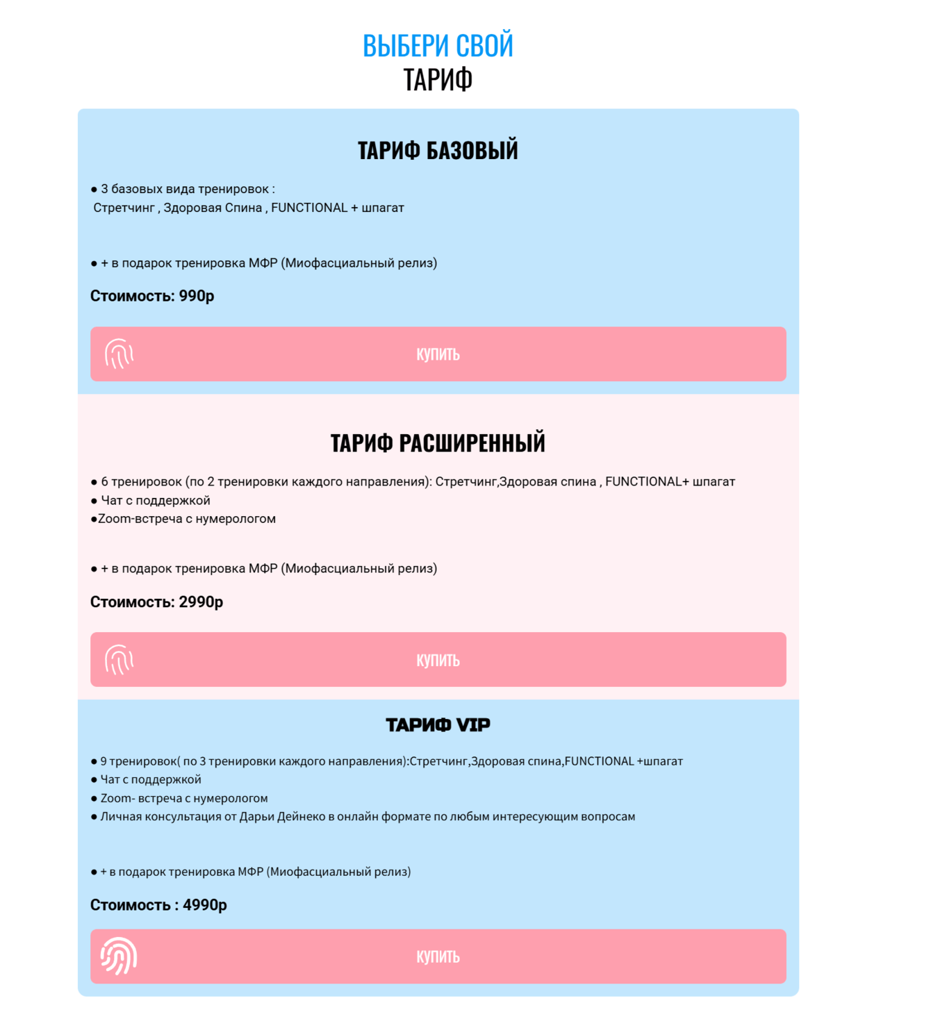 Спроектировали лендинг как конверсионную посадочную страницу под запись на пробное занятие: продумали структуру блоков и последовательность подачи информации, чтобы пользователь сразу видел оффер и понимал, куда нажимать, а затем получал ответы на ключевые вопросы без лишних действий. На первом экране сделали акцент на главном предложении и добавили понятный призыв к записи, далее собрали блоки с направлениями тренировок, описанием студии, преимуществами и социальным доказательством, чтобы закрыть возражения и усилить доверие. Подключили онлайн-запись через YCLIENTS, чтобы клиент мог выбрать время и записаться самостоятельно, без звонков и переписок. В финальной части страницы разместили тренеров, контакты, быстрые способы связи и карту, чтобы упростить шаг до визита и уменьшить количество уточняющих вопросов.