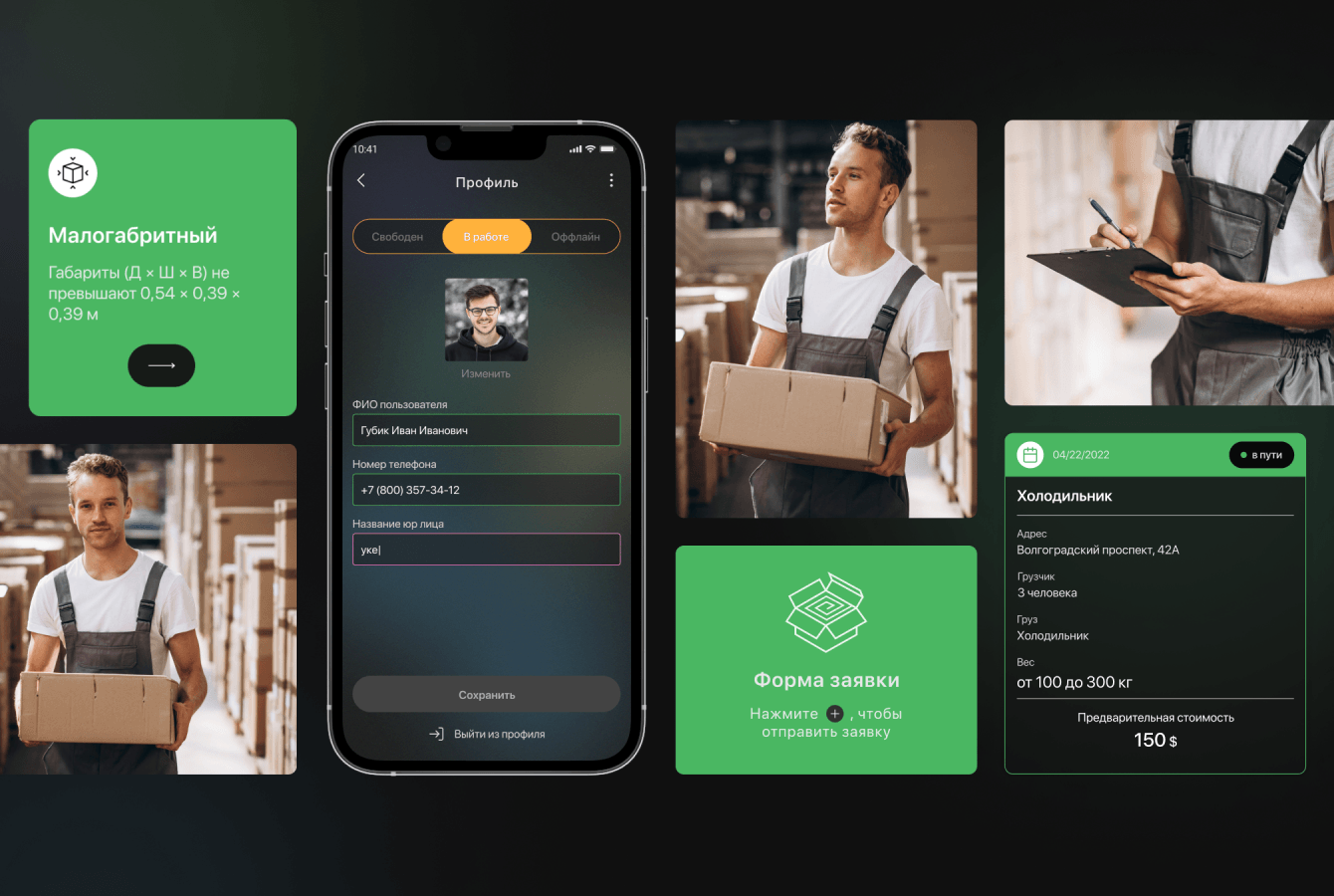 Разработать сервис, позволяющий быстро находить ближайших грузчиков, формировать заказ на доставку груза и производить оплату в приложении.