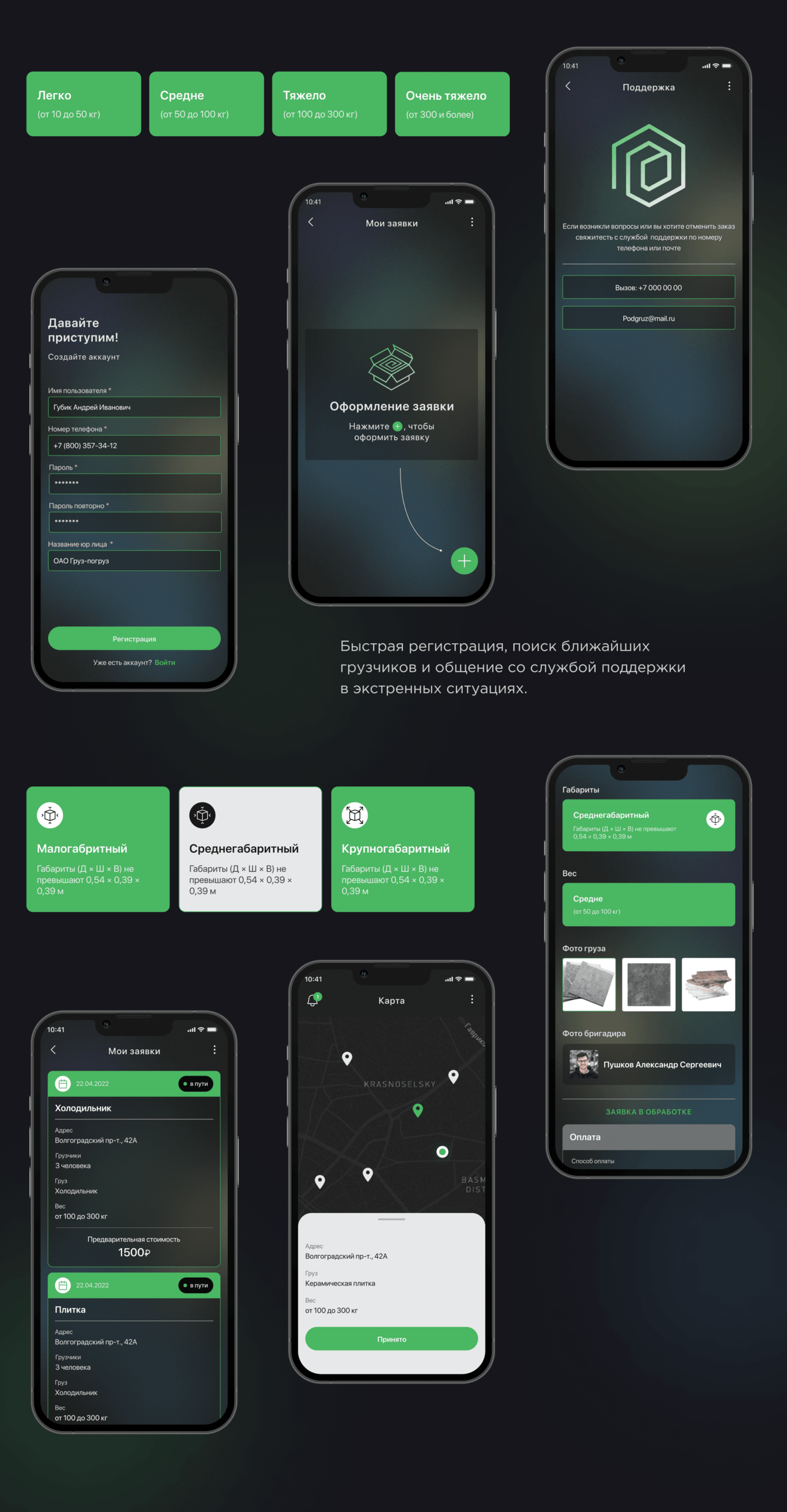 Разработать сервис, позволяющий быстро находить ближайших грузчиков, формировать заказ на доставку груза и производить оплату в приложении.