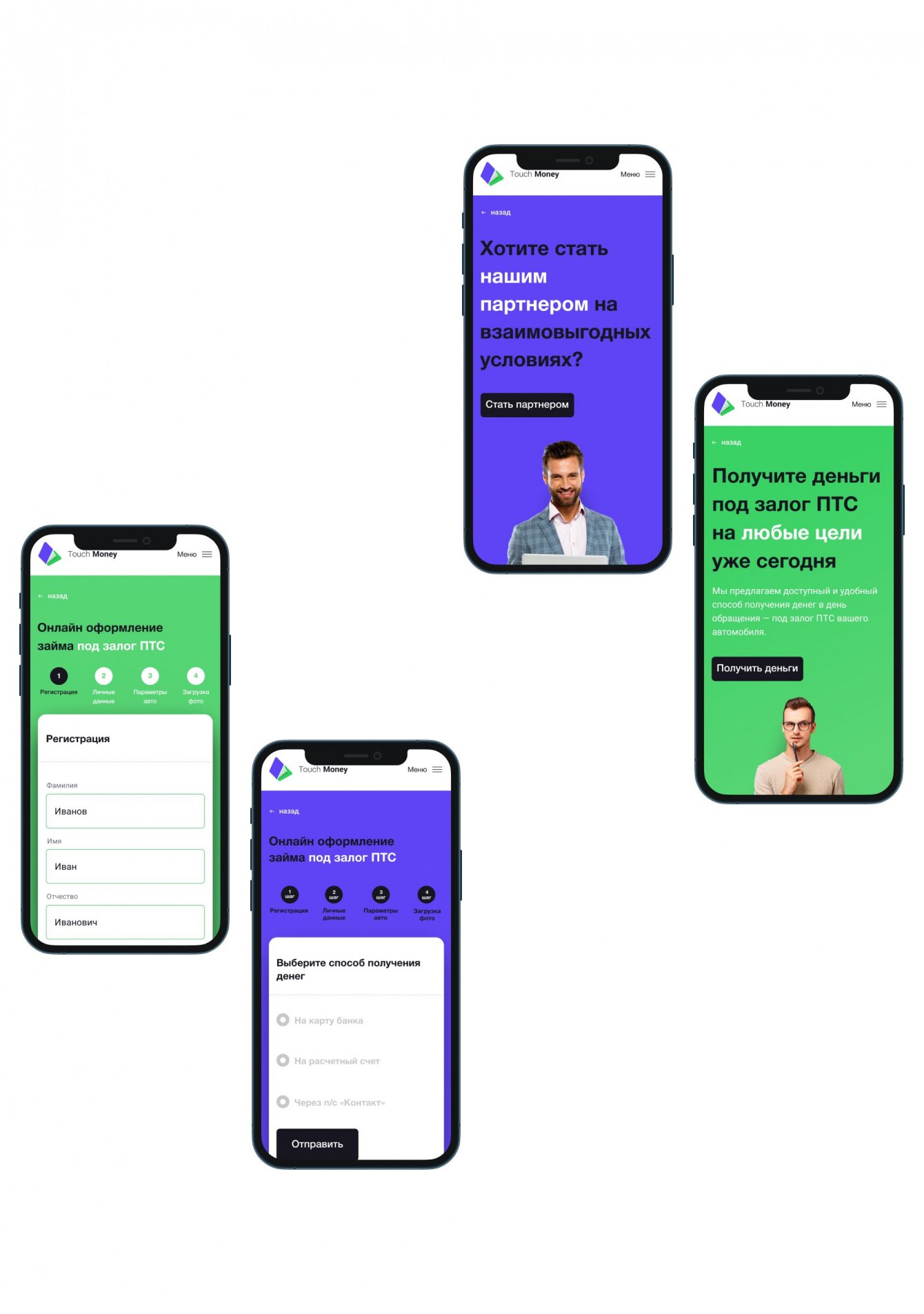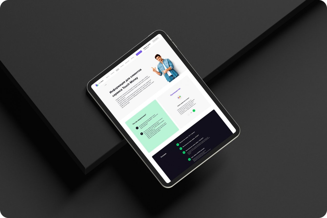 Touch money – микрофинансовая организация, которая обратилась к нам с рядом задач: от нейминга до создания сайта и личного кабинета. Мы предложили название, подготовили гайд, логотип, создали сайт. На сайт мы добавили личный кабинет с удобным графиком платежей, а также разработали наглядный и простой калькулятор займа. Все это сопровождается ярким и динамичным дизайном, палитра которого также была разработана нашей командой. Именно такие проекты мы называем «под ключ».