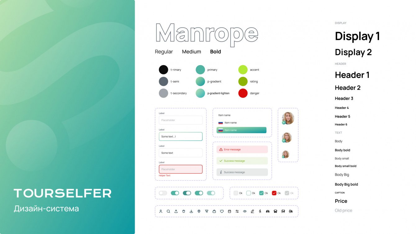 Также, мы создали дизайн-систему проекта Tourselfer. Подготовили компоненты, которые могут быть повторно использованы. Все это, поможет в кратчайшие сроки выпускать новый функционал и работать команде дизайнеров с единым guidline’ом.