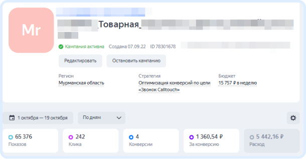 Оптимизировали кампанию по цели “Звонок”. Отслеживание звонков осуществлялось с помощью коллтрекинга CallTouch. Мы указали рекомендуемую цену за лид и недельный бюджет, чтобы реклама могла приносить по 10 лидов за неделю.