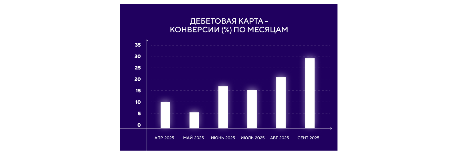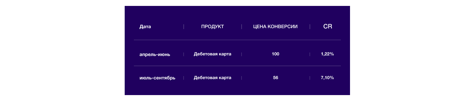 По дебетовой карте (таблица 2) получили такие данные: цену конверсий снизили на 44%, CR вырос с 1,22% до 7,10%. Число конверсии увеличилось на 69% при сопоставимом бюджете.