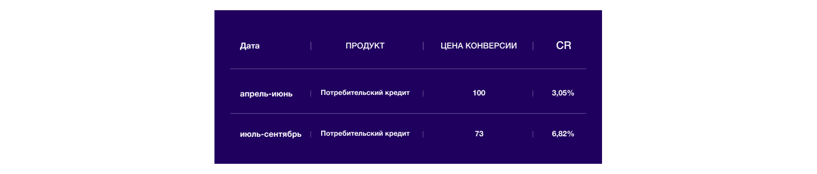 Из таблицы 3 видно: по потребительскому кредиту тоже получили позитивные результаты. Цена конверсий снизилась на 27%, CR вырос с 3,05% до 6,82%.