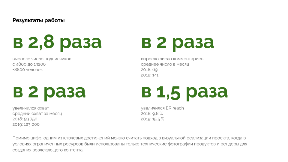 ● Помимо цифр, одним из ключевых достижений можно считать подход в визуальной реализации проекта, когда в условиях ограниченных ресурсов были использованы только технические фотографии продуктов и рендеры для создания вовлекающего контента.