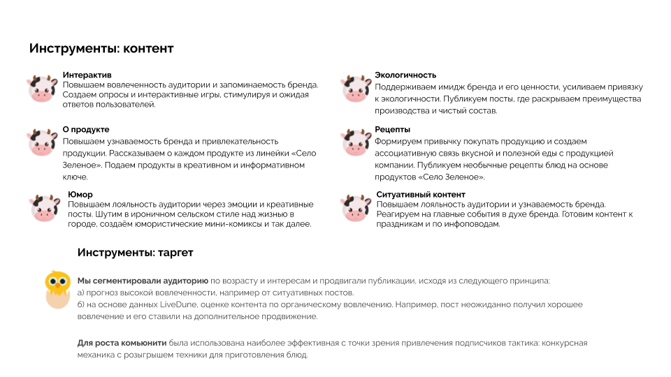 ● Для решения задачи мы проанализировали публикуемый контент ранее, отсортировав по вовлечению и соответствию количества реакций охвату. Параллельно мы изучили контент, публикуемый конкурентами бренда для изучения лучших примеров.