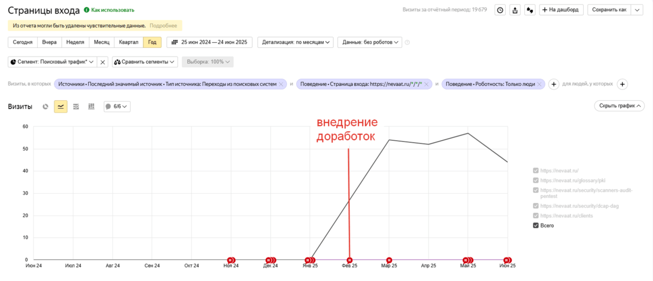 Рост видимости особенно заметен по новым страницам — услугам, решениям и глоссарию, которые стали основными точками входа на сайт.