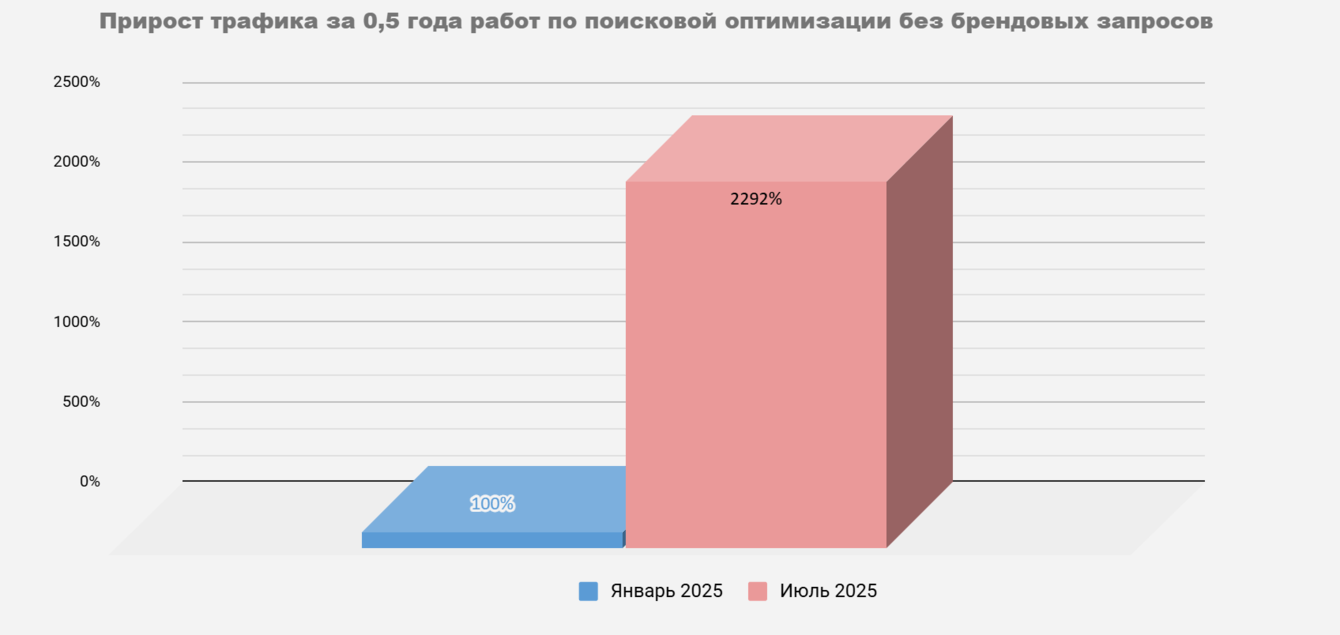 За шесть месяцев сайт прошёл большой путь. Но суммарный эффект все равно превзошёл прогнозы! Поисковый трафик вырос в 23 раза — это +2192% без брендовых запросов. Сайт, который едва появлялся в выдаче, теперь стабильно получает органику и уверенно конкурирует в своей нише.