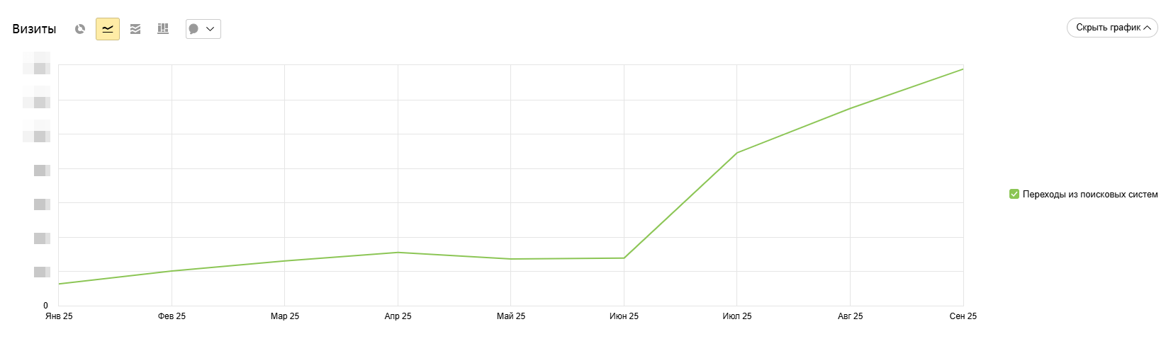 Также по итогам полугода работы сайт заметно укрепил позиции в поиске: доля видимости выросла до 9,6%, что выше среднего по отрасли для проектов аналогичного масштаба. Позиции по целевым запросам стабильно входят в ТОП-10 Яндекса и Google, а число ключевых слов в органике продолжает расти.