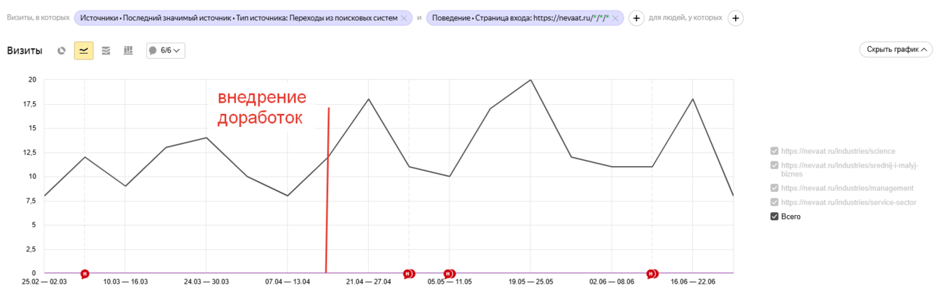 Во время анализа конкурентов заметили, что у лидеров есть страницы под конкретные отрасли: банковскую, промышленную, торговую. Мы проверили спрос — есть небольшой, но коммерчески релевантный. Решили не откладывать и создали свой раздел с текстами для разных сегментов бизнеса.