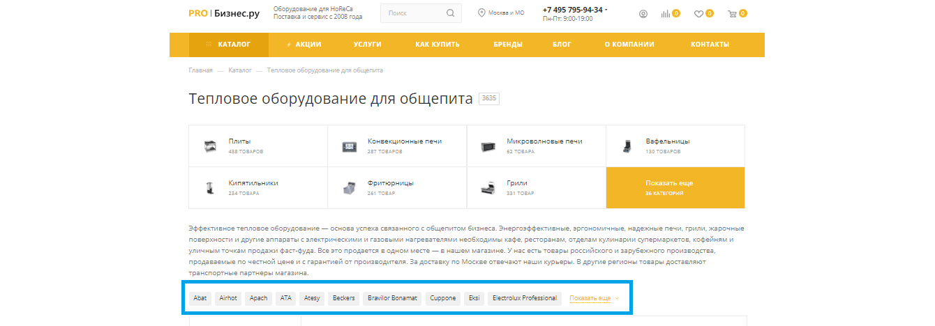 Например, в разделе «Холодильное оборудование» в фильтре задано более 50 температурных режимов и столько же брендов.