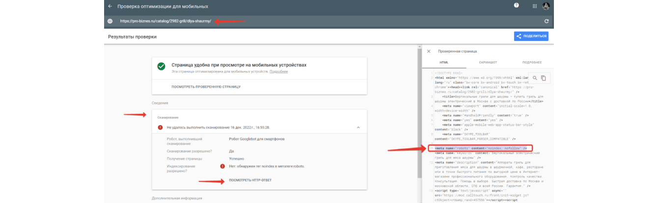 Мы предположили, что в коде есть тег, закрывающий страницу от индексации. Стали искать его, но стандартная проверка исходного кода его не показывала.