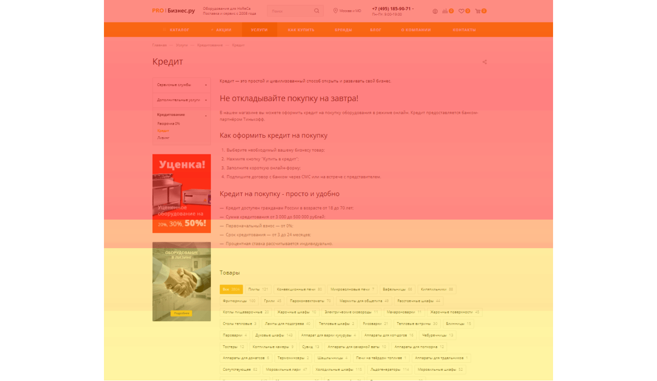 Карта скроллинга подтверждает, что пользователи изучают первый экран с описанием услуги и игнорируют список товаров.
