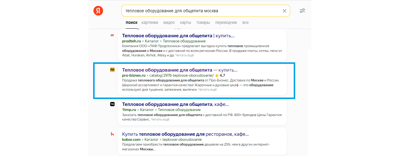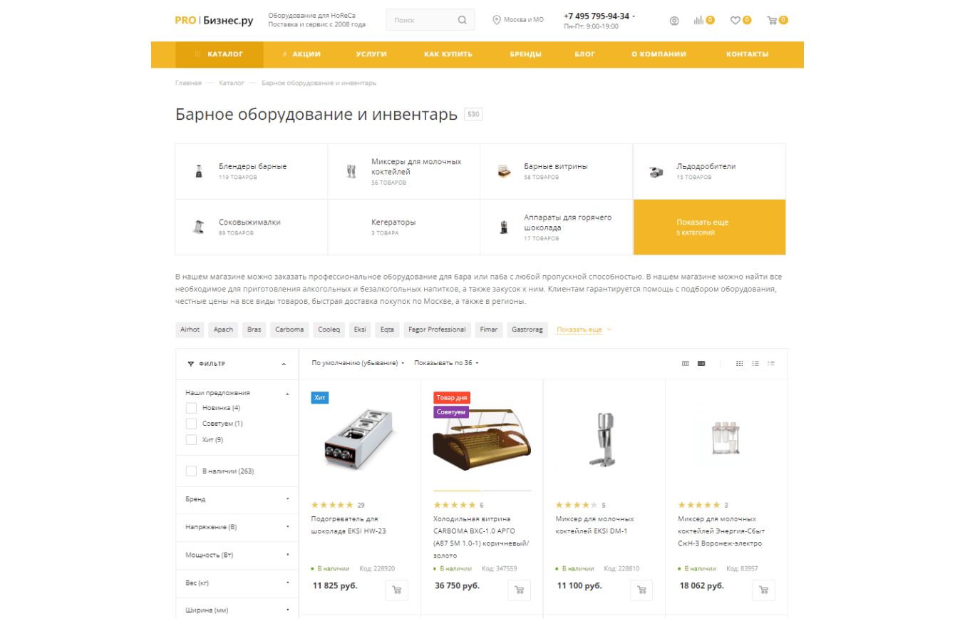 Например, страница листинга «Барное оборудование и инвентарь» https://pro-biznes.ru/catalog/2963-barnoe-oborudovanie/ оптимизирована под группу ключевых слов: [барное оборудование], [оборудование для бара], [оборудование для паба], [барное оборудование купить], [барное оборудование цена] и другие.