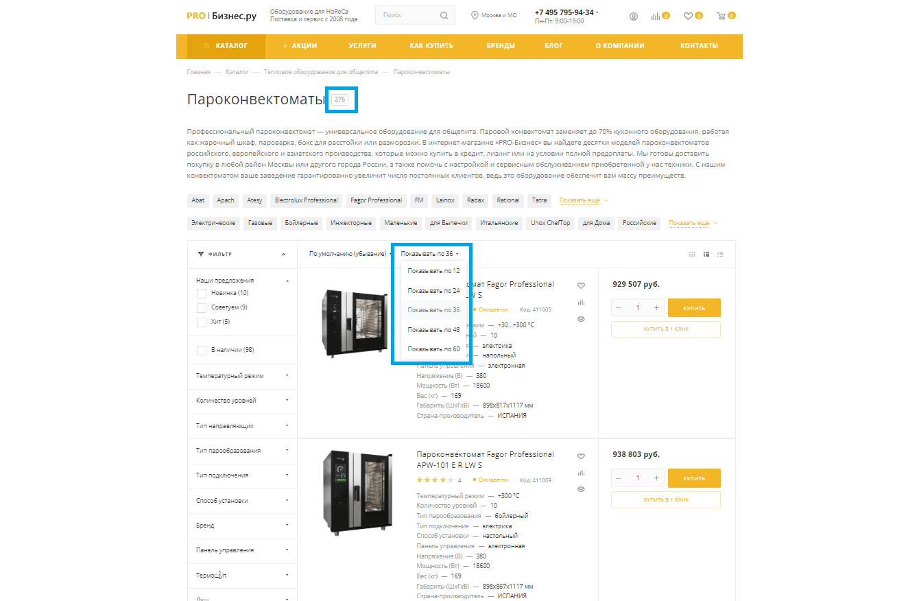Например, в каталоге pro-biznes.ru 276 моделей пароконвектоматов. Если вывести их на одной странице, она получится очень длинной, и на ней будет сложно ориентироваться. Поэтому она делится на несколько пагинационных страниц — по 12, 24, 36 и т.д. моделей, по выбору пользователя.