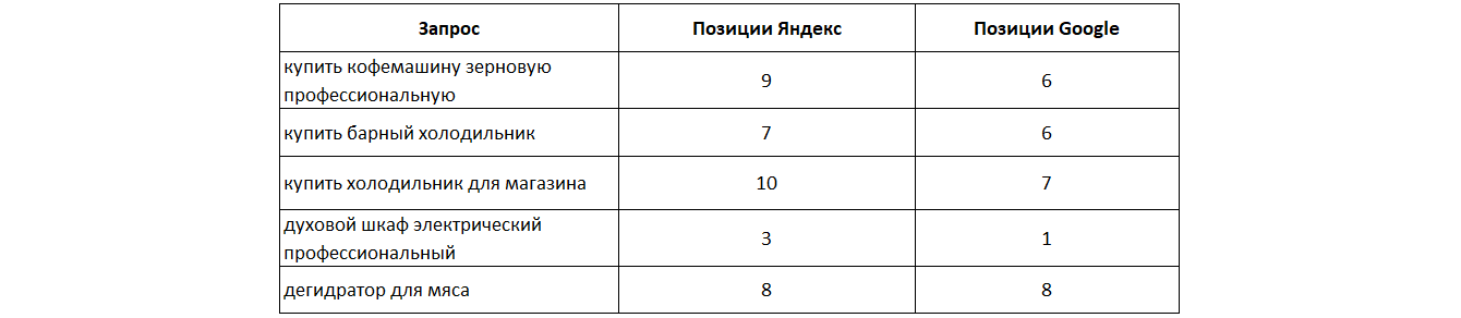 Проект занимает топ-10 Яндекса и Google по целевым запросам в тематике «Оборудование для HoReCa», часть из них представлена ниже: