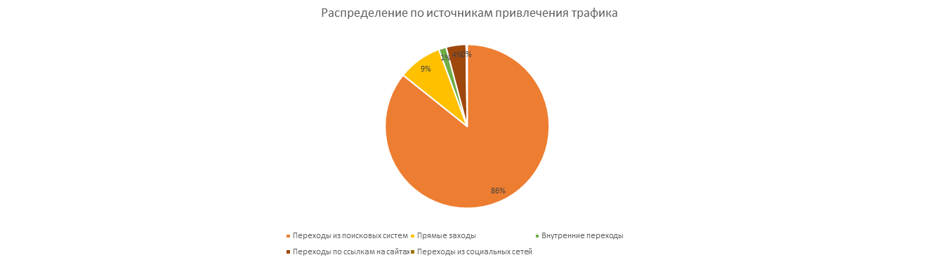 Основной трафик — переходы из поисковых систем. Доля трафика из поиска составляет 85,75%. Трафик с платных источников рекламы не указан, это конфиденциальная информация.