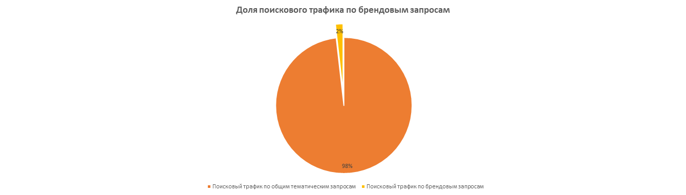 Доля поискового трафика по брендовым запросам (включающим название компании) составляет всего 1,8%. Поисковый трафик по общим тематическим запросам — 98,2%.