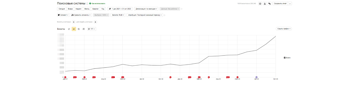 За почти два года работы (с декабря 2021 года по октябрь 2023 года) трафик из поисковых систем вырос более чем в 7,5 раз — на 655% без брендовых запросов.