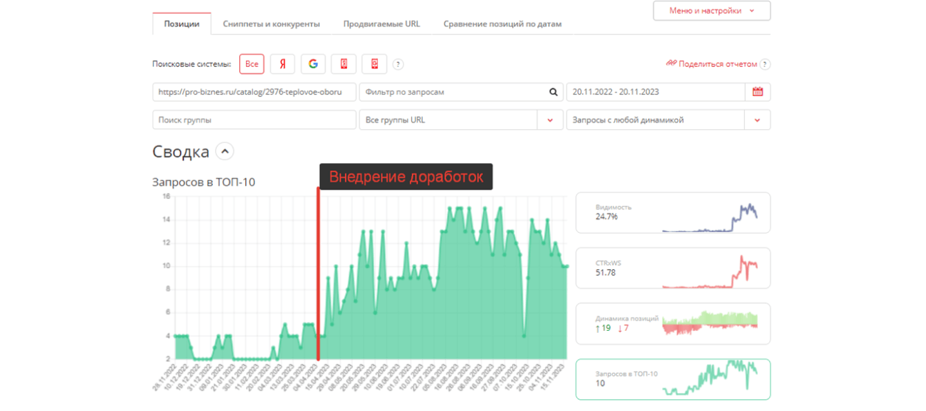 Эти доработки подняли видимость карточек товаров в поисковых системах. Вот, например, статистика по количеству запросов в топ-10 на странице https://pro-biznes.ru/catalog/2976-teplovoe-oborudovanie/: