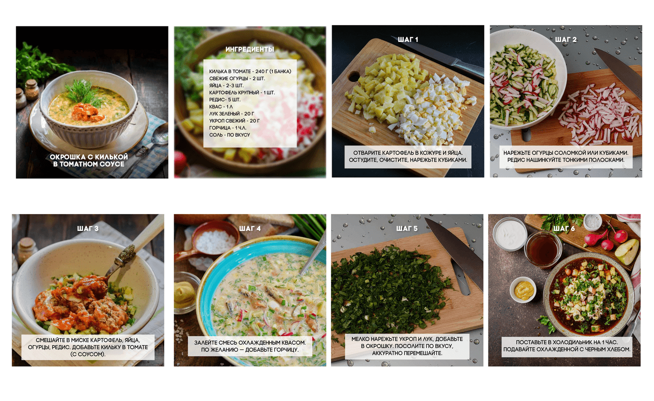 Когда мы зашли в проект, главной проблемой был «визуальный голод». У нас практически не было исходных материалов — только ссылки на товары и несколько видео с рецептами.