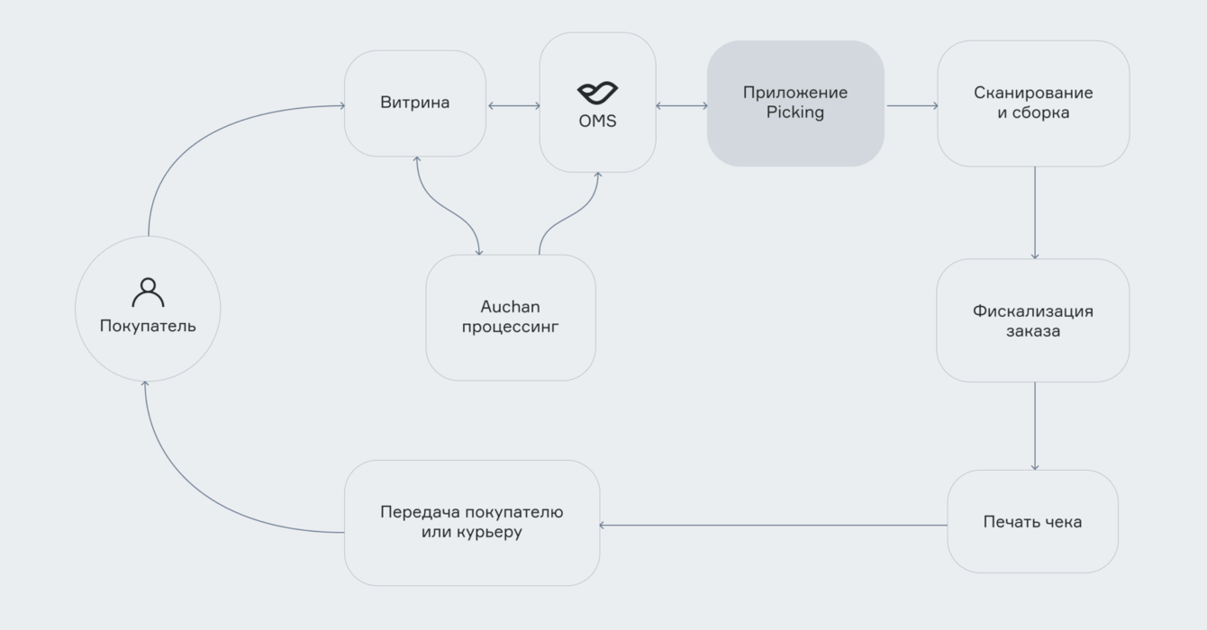 1. В OMS поступает заказ, который передается в интерфейс cборки;