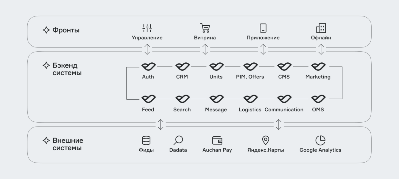 К старту разработки у Ашана была готова бизнес-логика программы лояльности. В задачи разработчиков входило заставить одинаково работать эту логику во всех каналах. Для этого предстояло синхронизировать работу семи разных подрядчиков, отвечающих за разные области: от CRM до касс в офлайновых гипермаркетах.