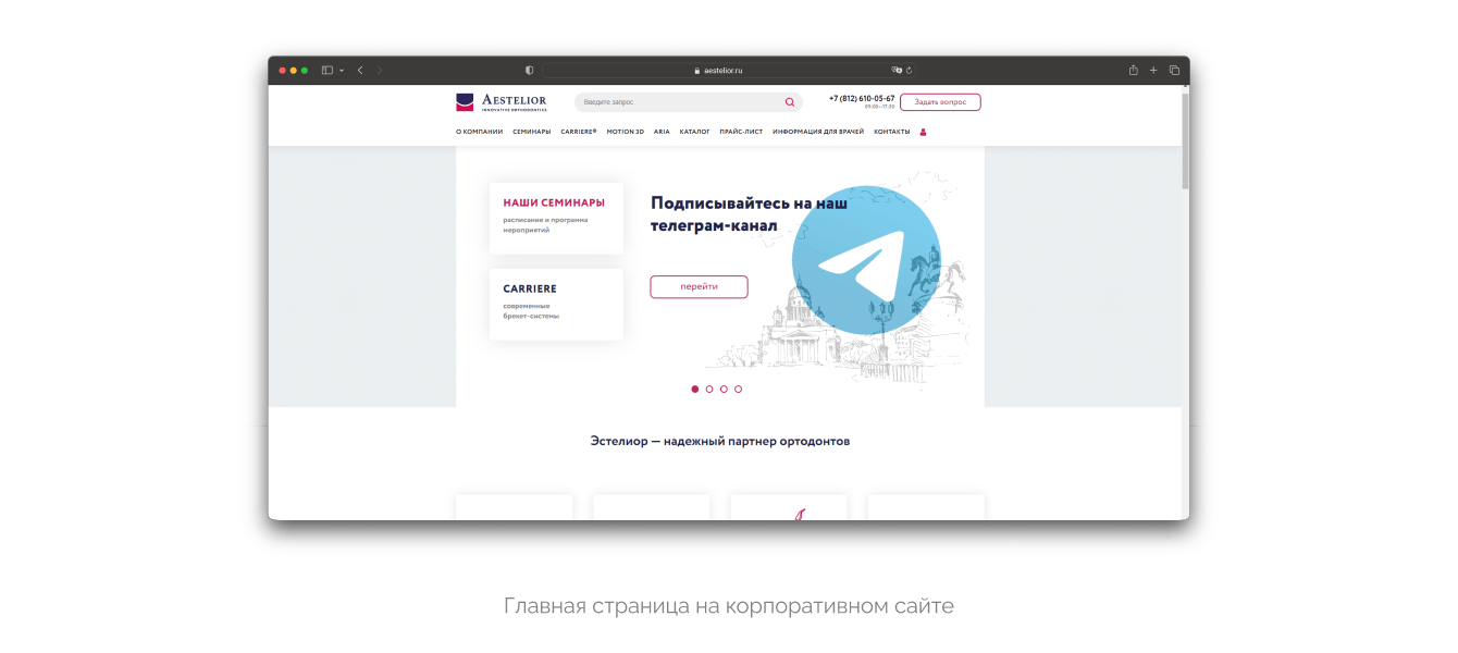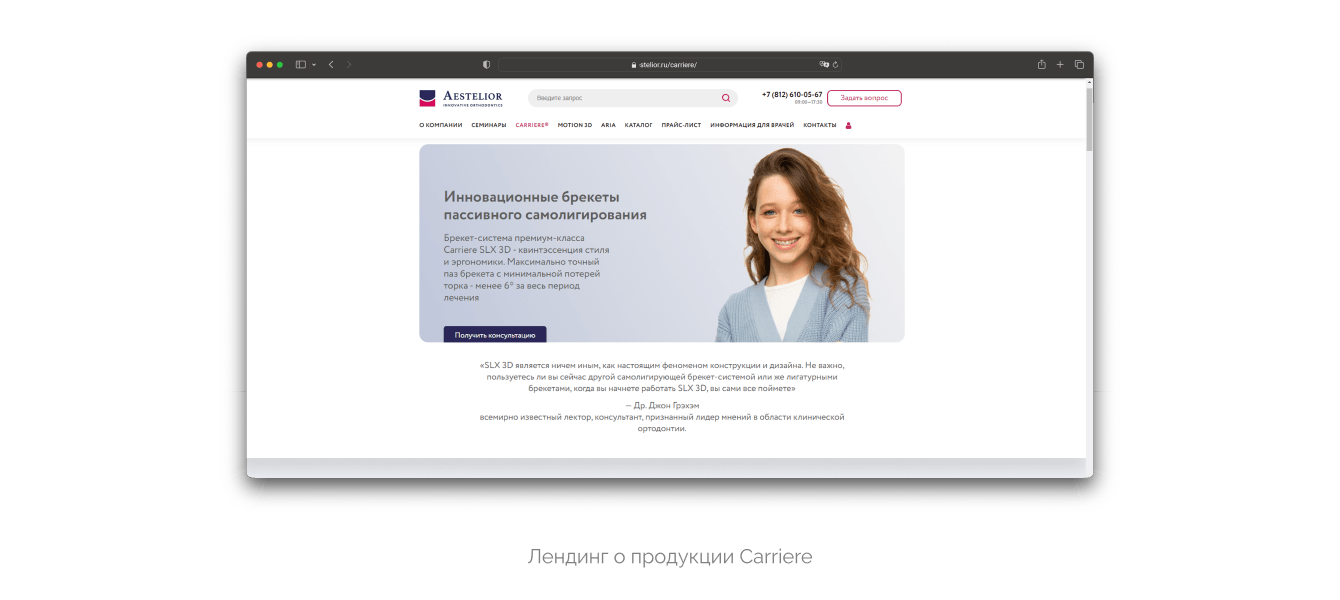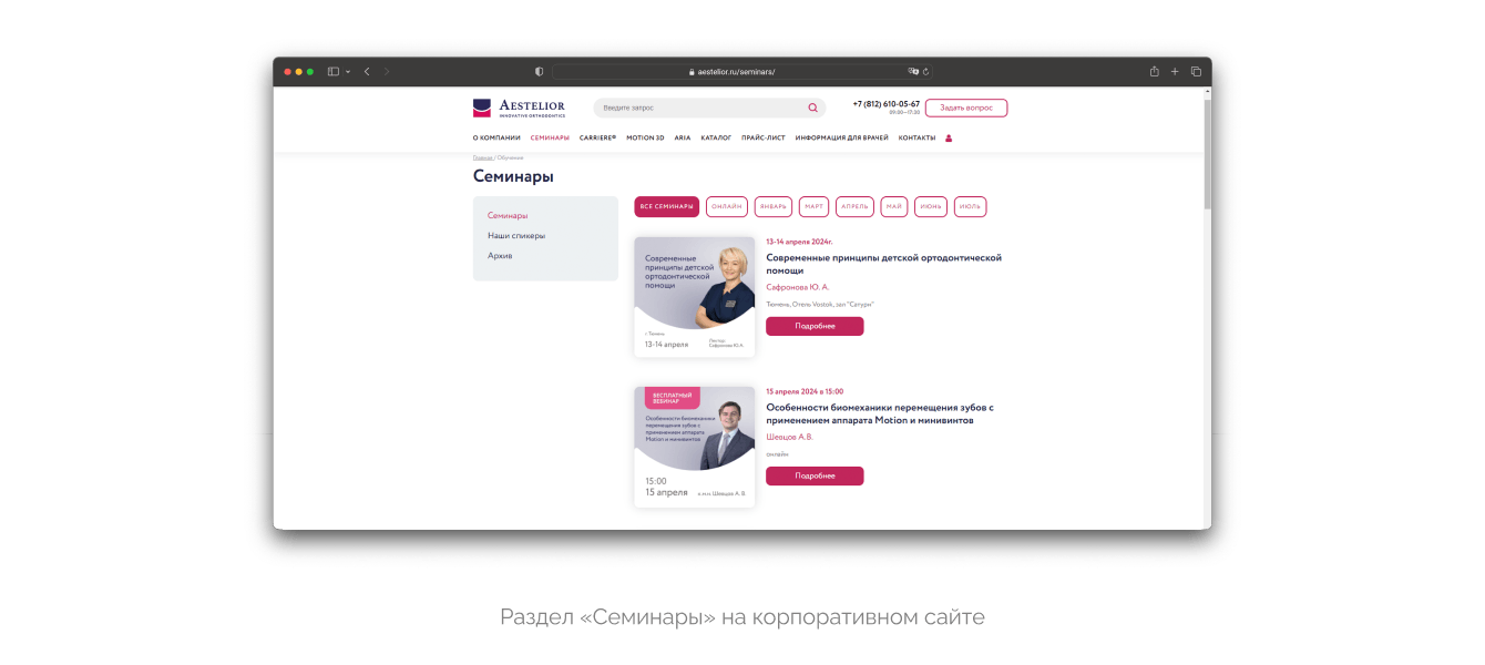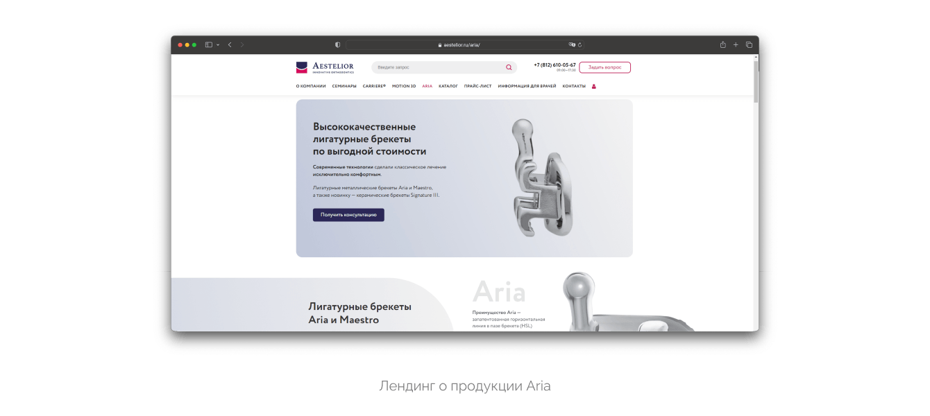 Клиент пришел к нам с корпоративным сайтом, на котором были информационные разделы «О компании», «Новости», «Семинары» и с тремя лендингами про отдельные продукты в виде верстки: Carriere, Motion 3D и Aria.