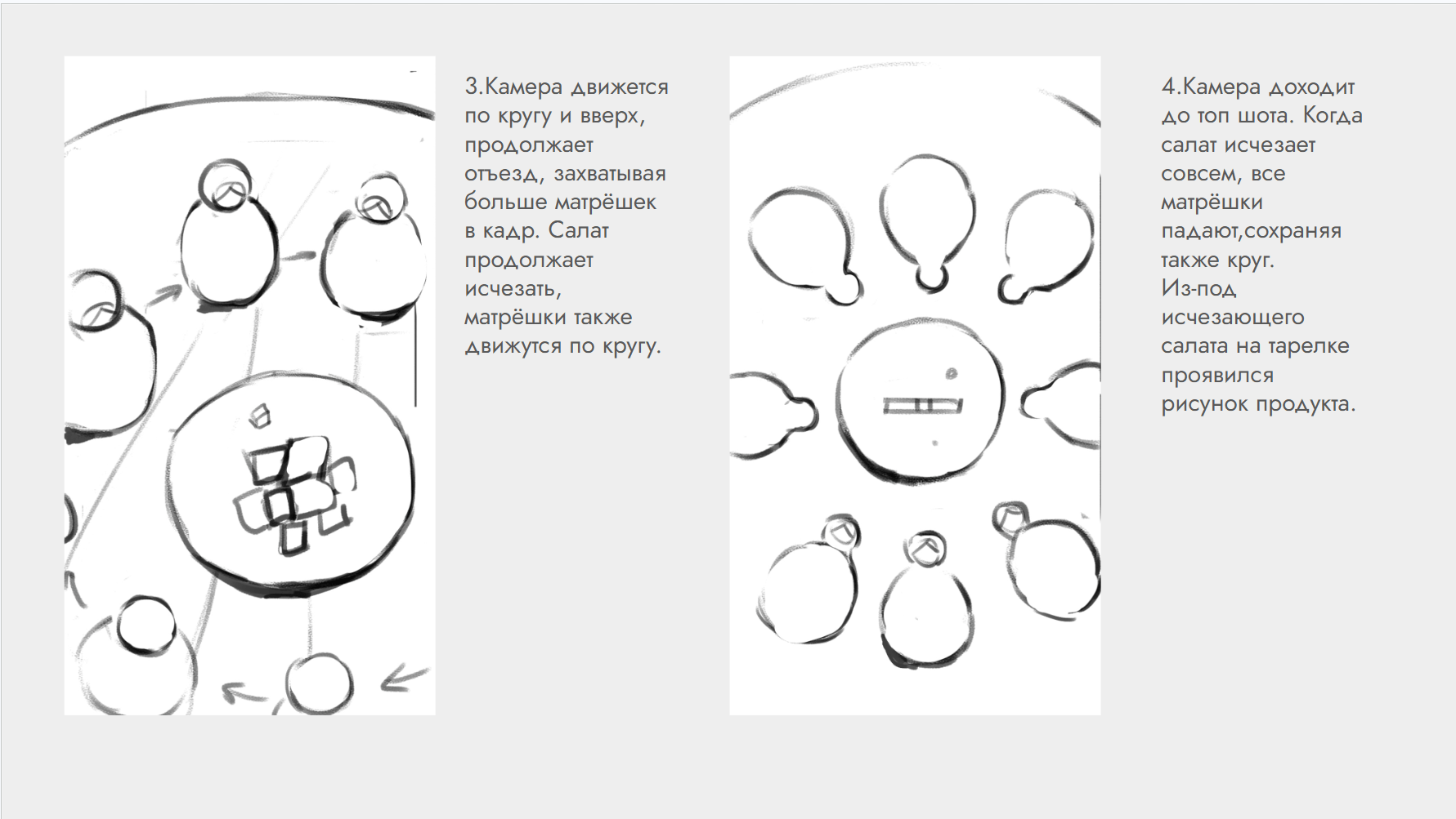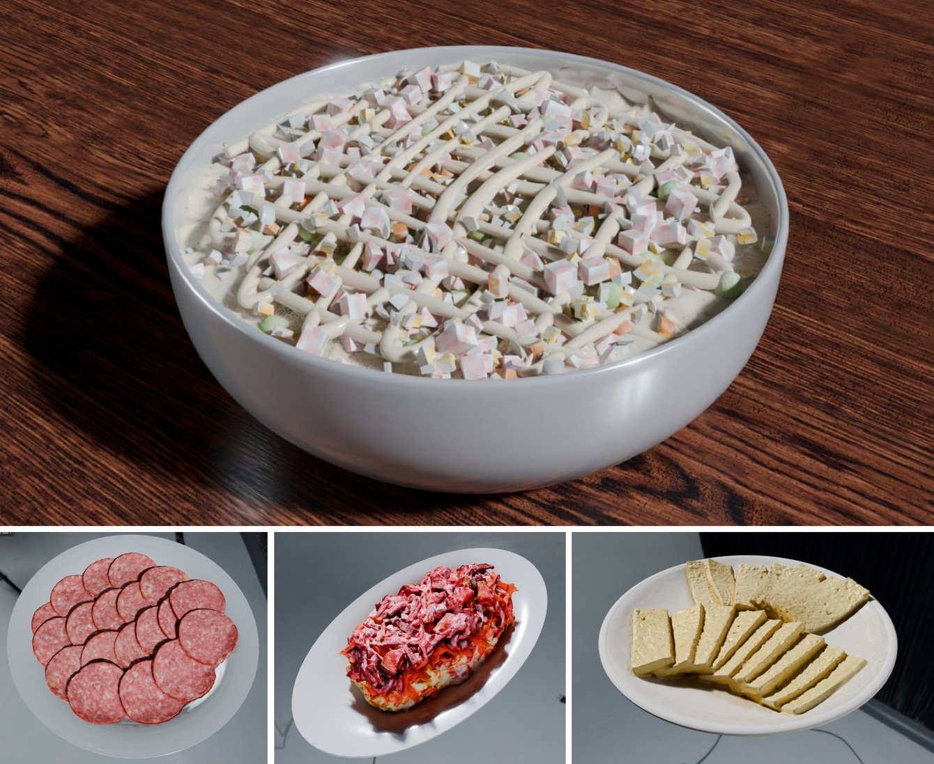 Особенно интересная история стоит за блюдами в ролике с Оливье. Все объекты на столе — фотосканы реальной пищи, перенесённой в 3D. Чтобы получить модель, мы поместили салаты в боксы и сделали 70-80 снимков со всех сторон.