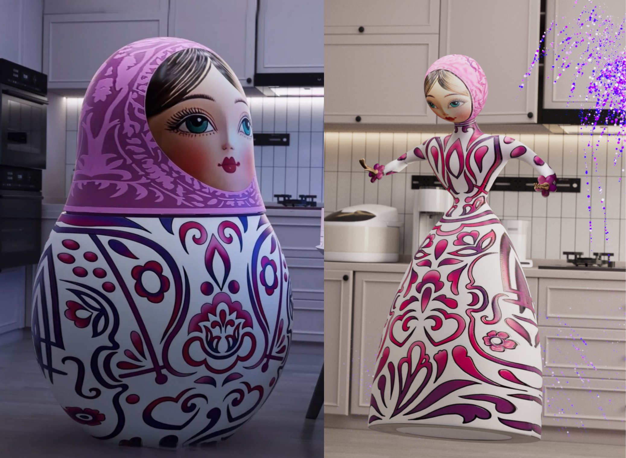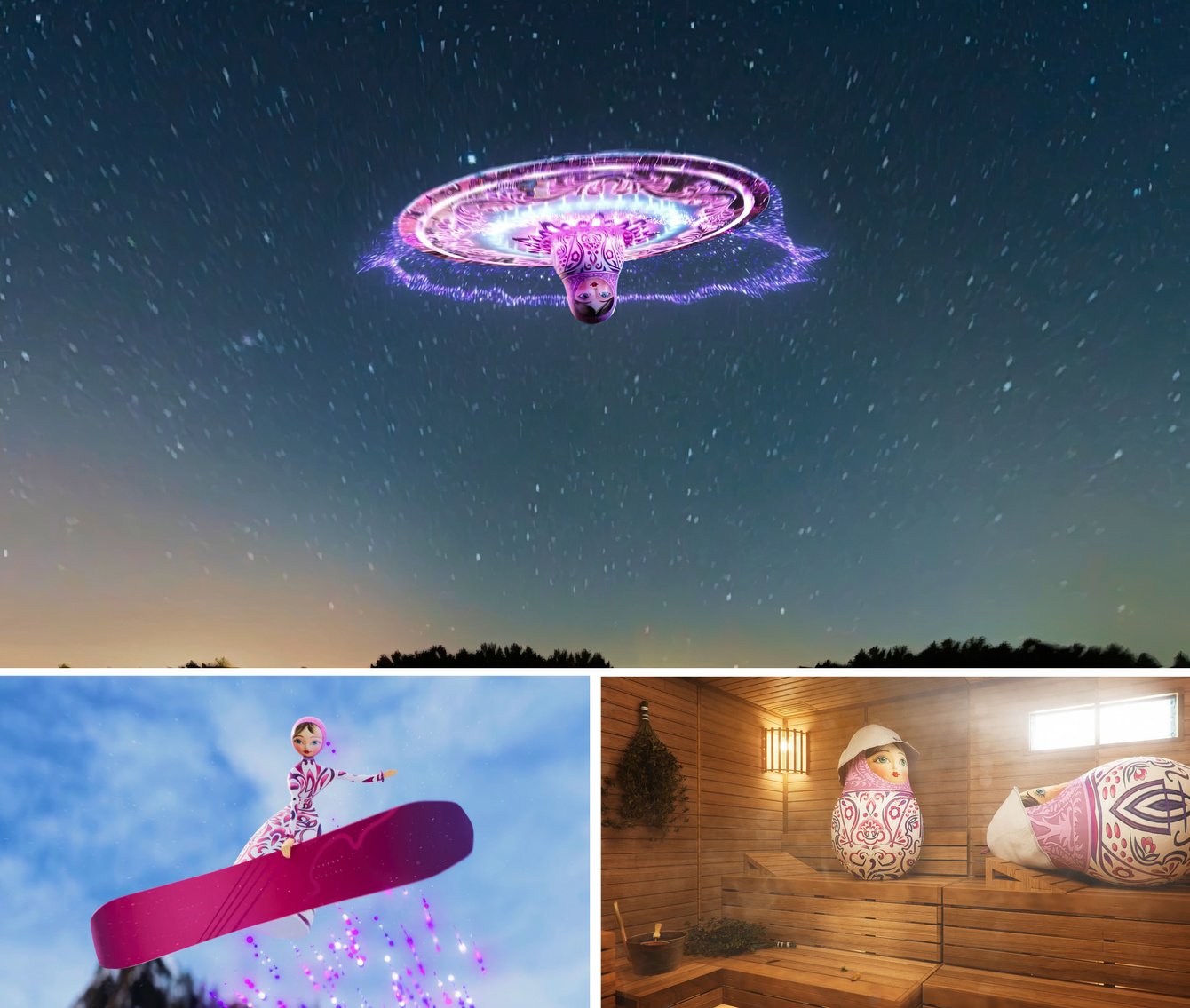 Всего было создано 8 full-CG роликов, смело работающих с российской действительностью. Матрёшка в них живёт своей лучшей жизнью: празднует Новый год, катается на сноуборде, забирает покупки из маркетплейса, даже на море ездит.