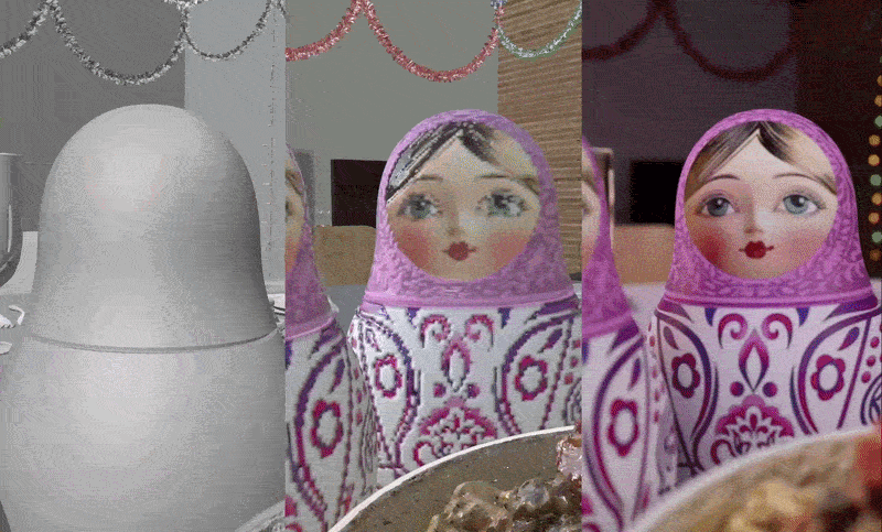 Когда мы определились с героем, приступили к разработке концептов для обоих состояний матрёшки: до и после трансформации. И тот, и тот образ включает в себя орнаментальные мотивы, стилизованные под ручную роспись. На основе концепта была создана 3D-модель Матрёшки, которая перемещалась из ролика в ролик.
