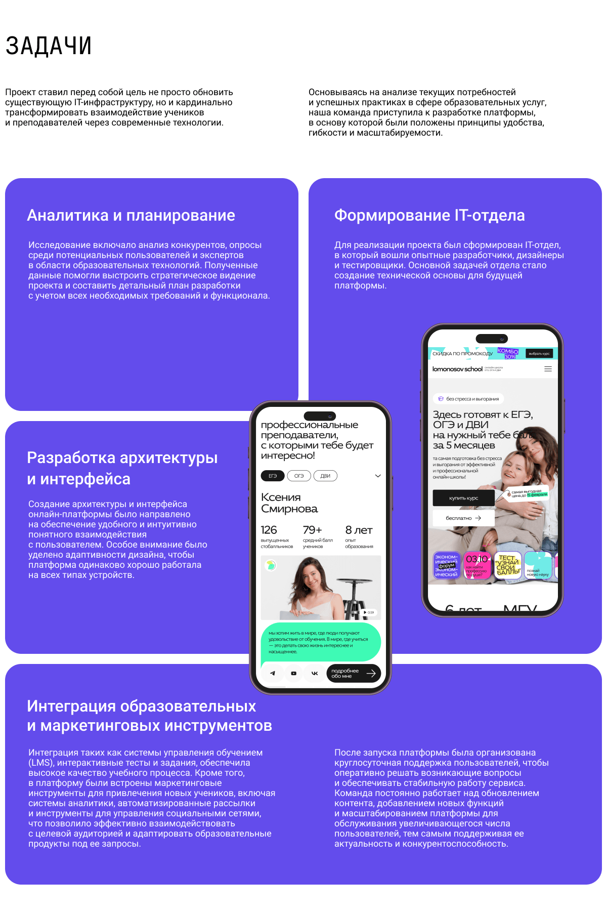 Наше сотрудничество с Lomonosov School началось в конце 2020 года. На тот момент онлайн-школа уже имела многостраничный сайт на WordPress и систему дистанционного обучения Moodle. Главным минусом этих IT-продуктов был ограниченный функционал, быстрое устаревание и медленная адаптация к рынку