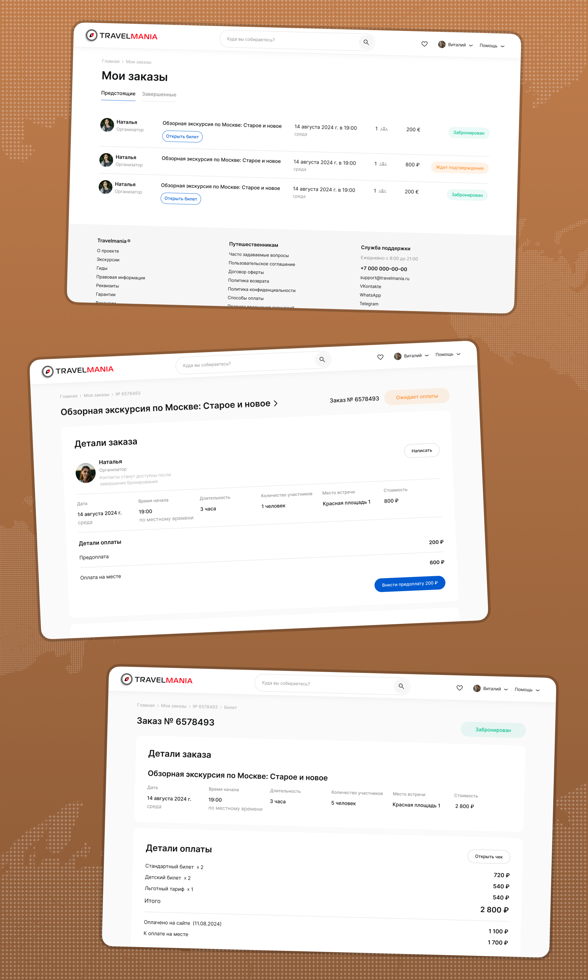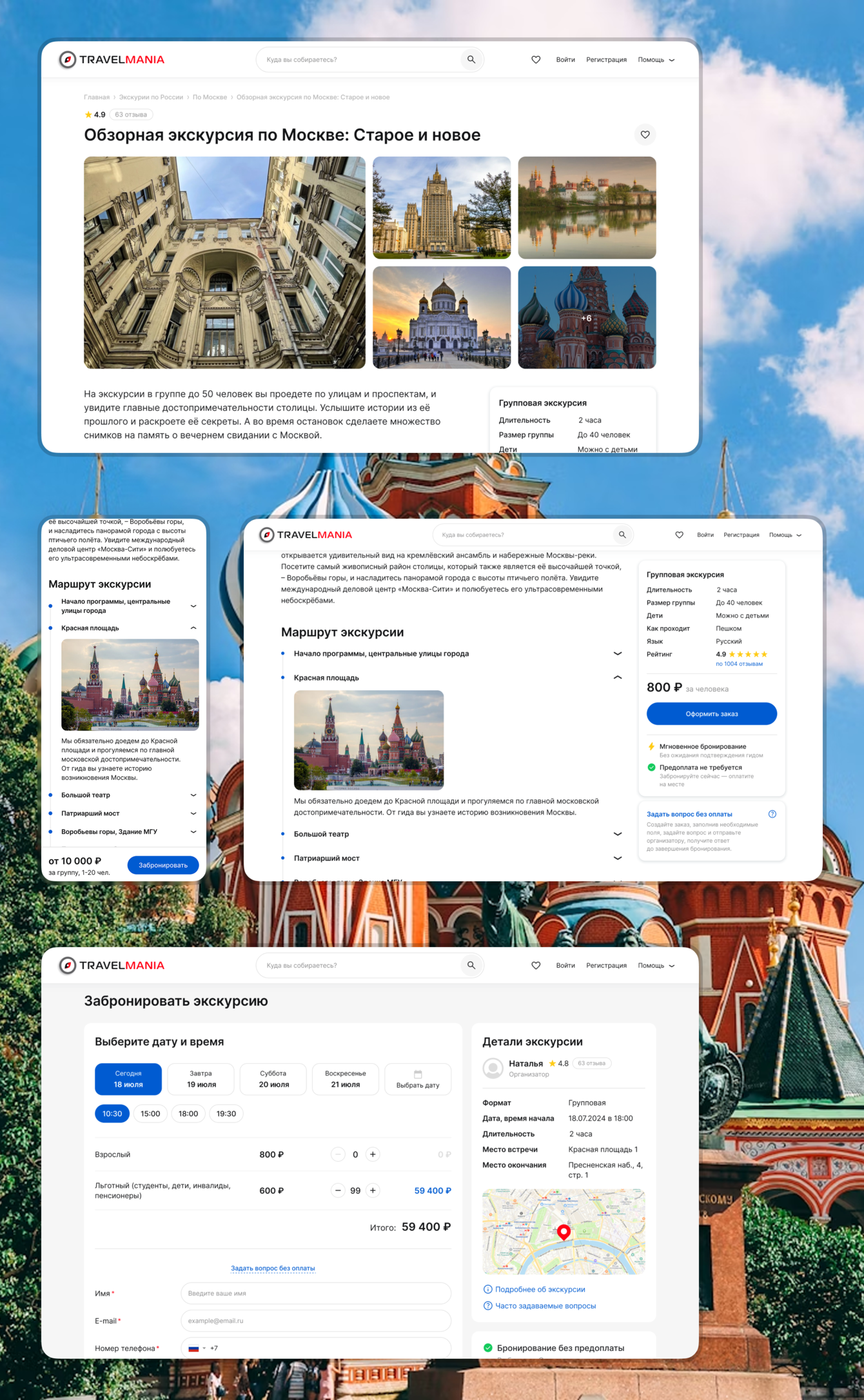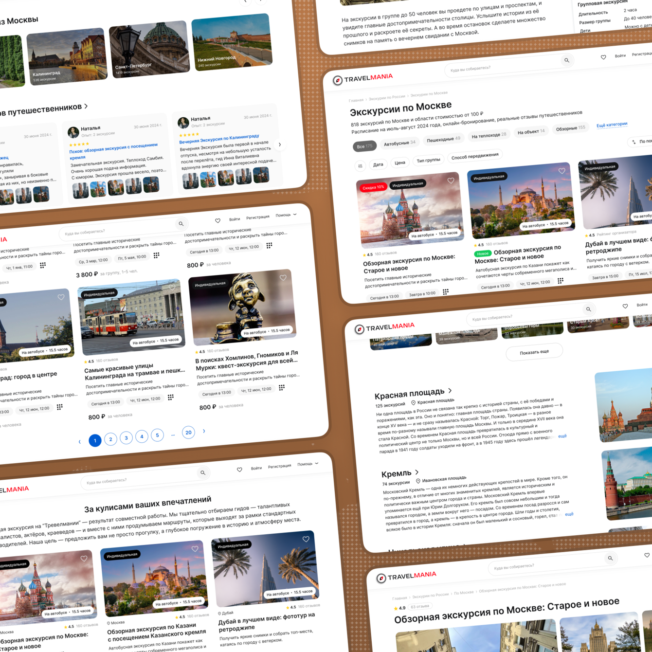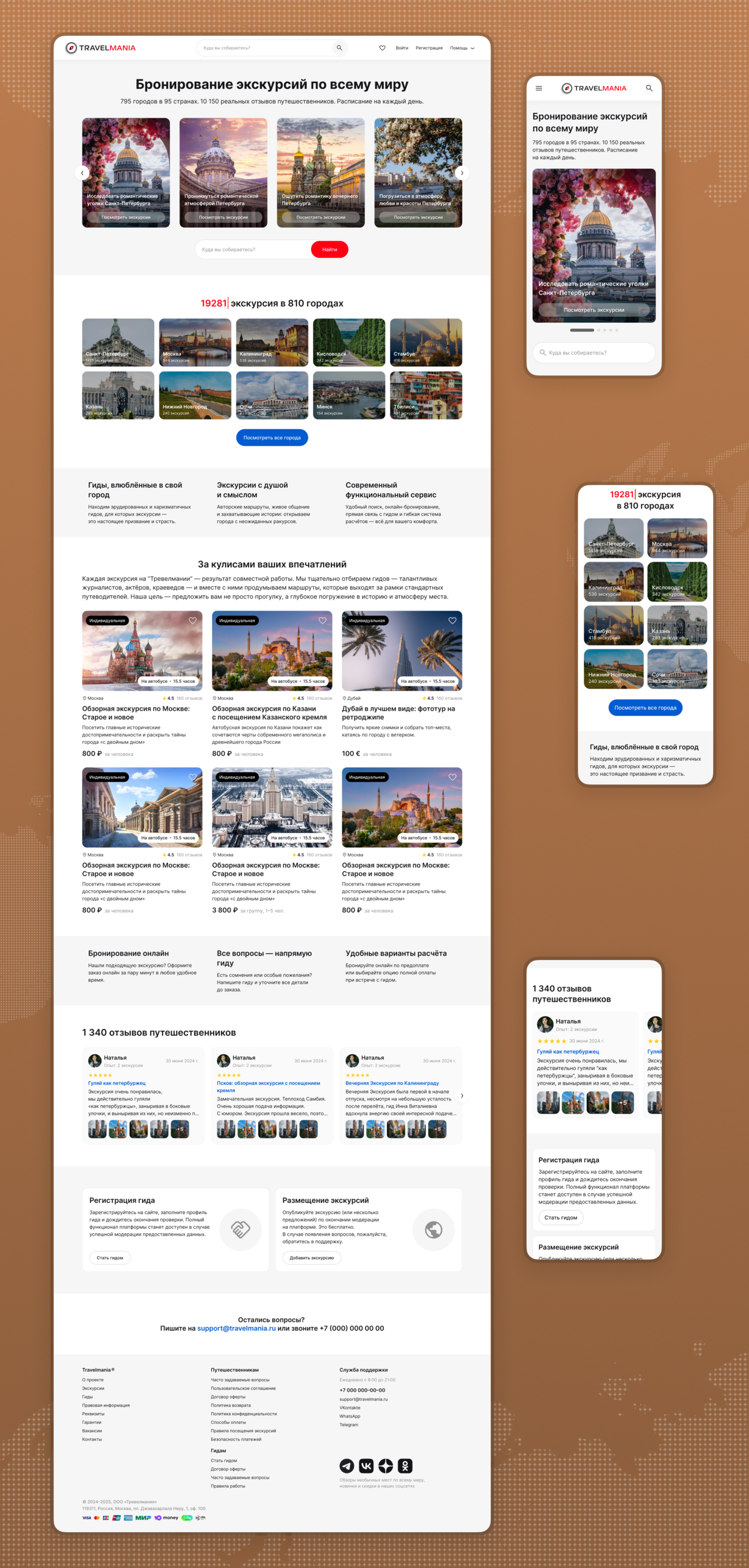 При разработке Travelmania мы последовательно проектировали ключевые разделы платформы, которые формируют полный пользовательский сценарий от поиска экскурсии до взаимодействия с гидом и управления бронированиями.