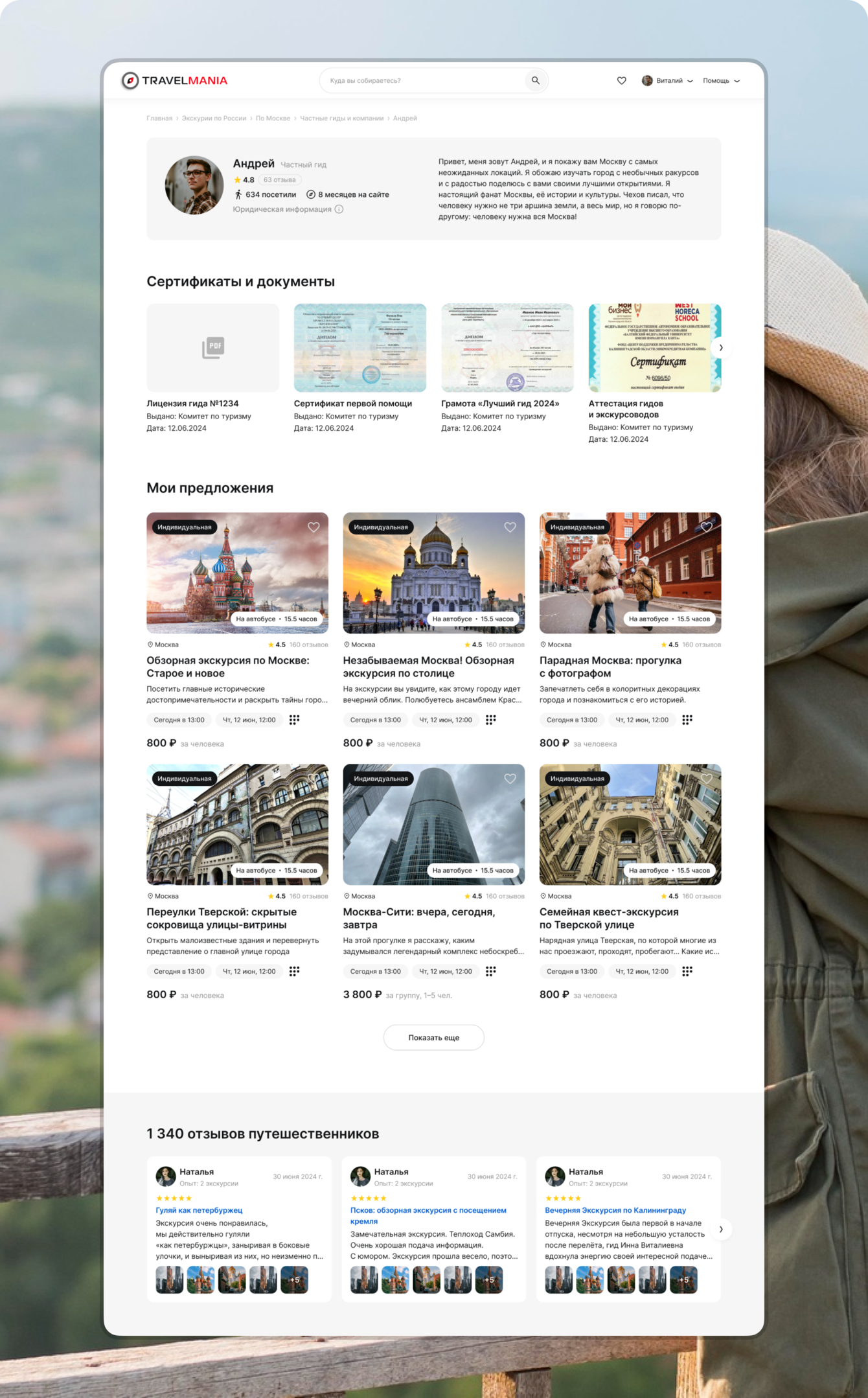 Каждый гид имеет собственную страницу, которую может оформить самостоятельно. На странице отображается информация о гиде, рейтинг, отзывы, подтверждающие документы и список доступных экскурсий.
