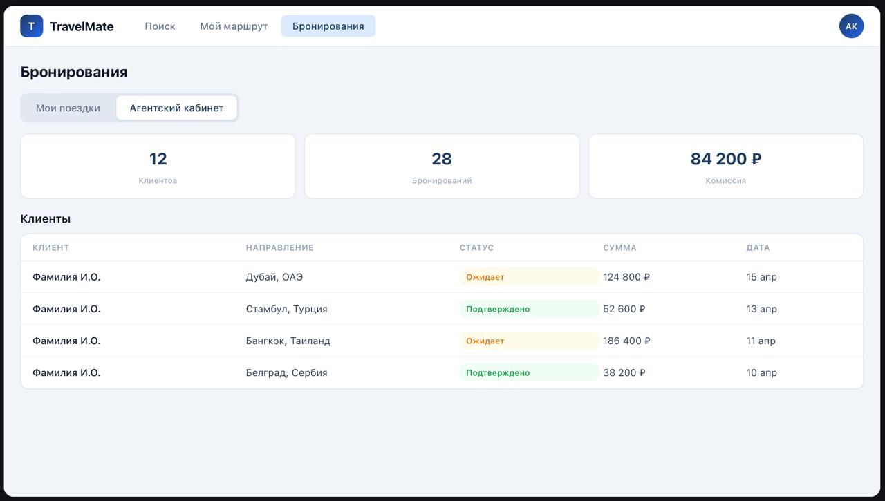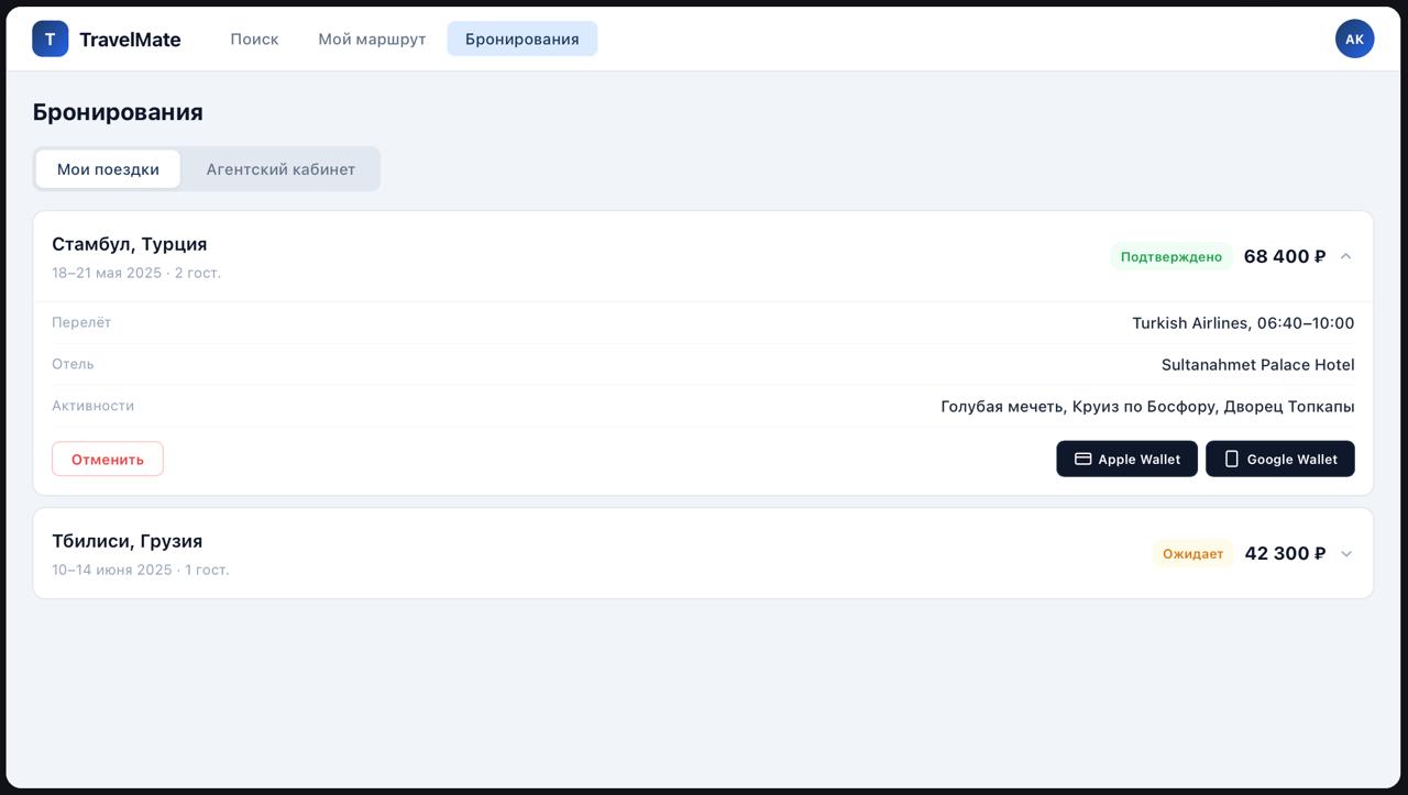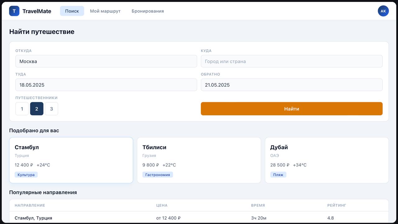 Задача: разработать сервис для планирования путешествий с AI-рекомендациями, подбором маршрутов и возможностью бронирования.