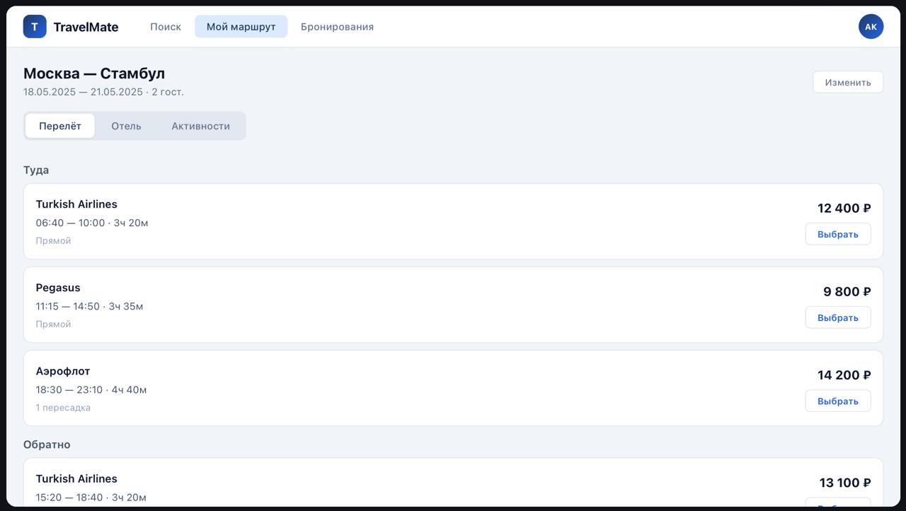 • реализовать пользовательские сценарии: выбор направления, дат, интересов и бюджета