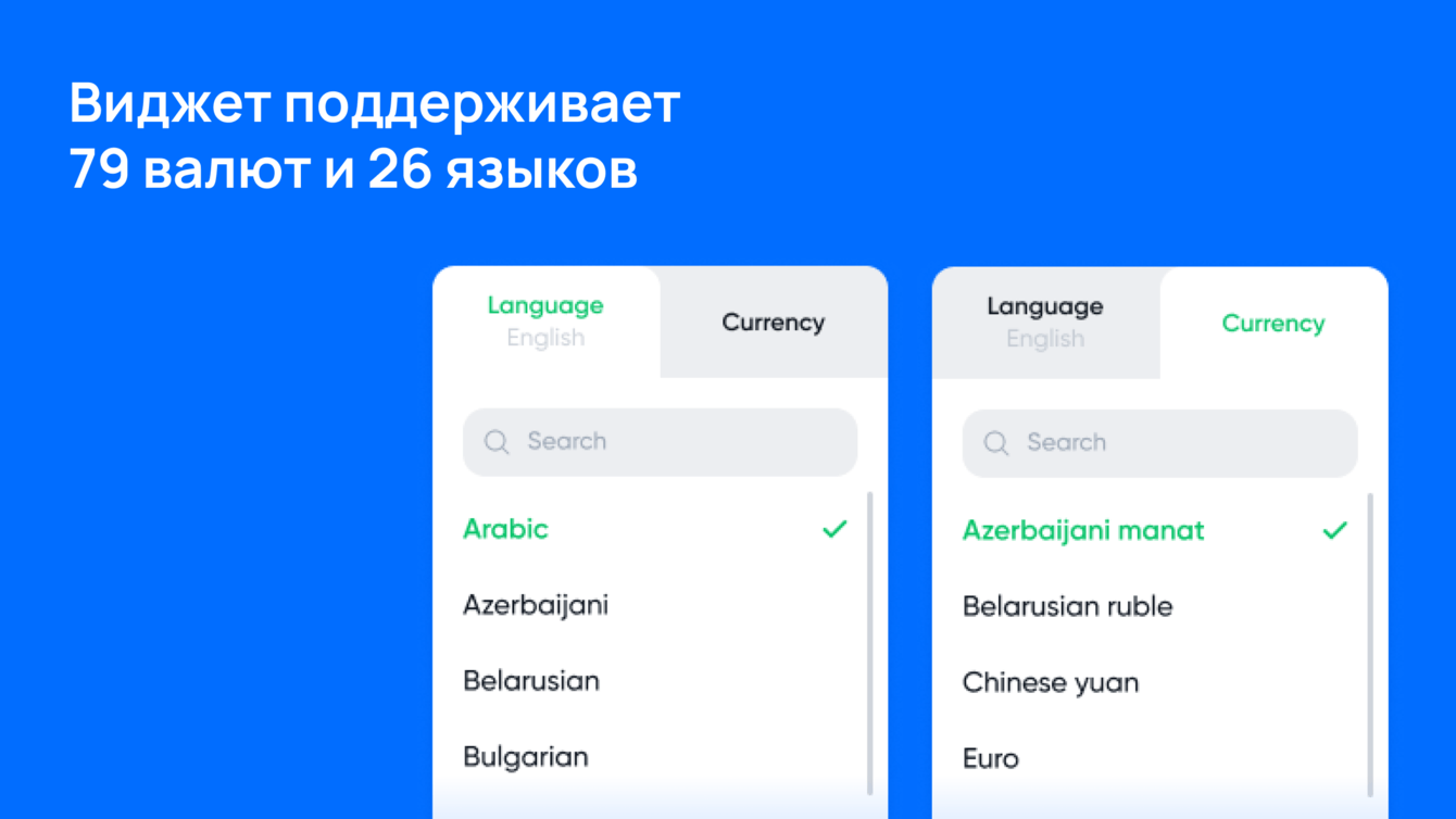 - Провели интеграцию с системой локализации Crowdin. Виджет поддерживает 61 язык. Переводы подтягиваются автоматически в зависимости от выбранной локации или настроек пользователя. Если нужно ограничить вывод языков в виджете, это можно настроить в ЛК (например язык виджета по умолчанию).